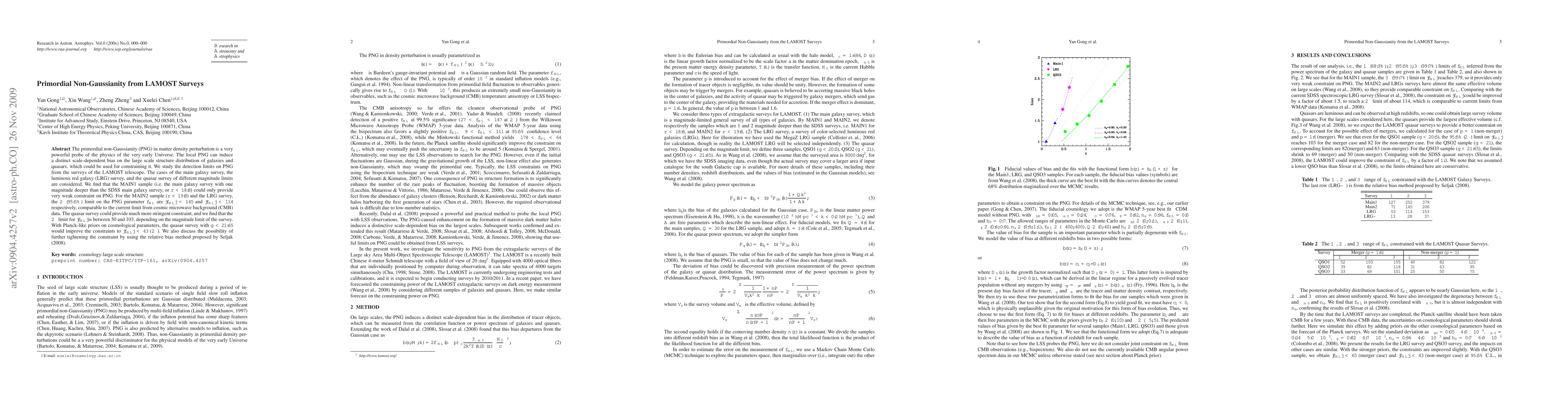 The primordial non-Gaussianity (PNG) in matter density perturbation is a very powerful probe of the physics of the very early Universe. The local PNG can induce a distinct scale-dependent bias on the large scale structure distribution of galaxies and quasars, which could be used for constraining it. We study the detection limits on PNG from the surveys of the LAMOST telescope. The cases of the main galaxy survey, the luminous red galaxy (LRG) survey, and the quasar survey of different magnitude limits are considered. We find that the MAIN1 sample (i.e. the main galaxy survey with one magnitude deeper than the SDSS main galaxy survey, or r<18.8) could only provide very weak constraint on PNG. For the MAIN2 sample (r<19.8) and the LRG survey, the 2\sigma (95.5%) limit on the PNG parameter f_{NL} are |f_{NL}|<145 and |f_{NL}|<114 respectively, comparable to the current limit from cosmic microwave background (CMB) data. The quasar survey could provide much more stringent constraint, and we find that the 2\sigma limit for |f_{NL}| is between 50 and 103, depending on the magnitude limit of the survey. With Planck-like priors on cosmological parameters, the quasar survey with g<21.65 would improve the constraints to |f_{NL}|<43 (2\sigma). We also discuss the possibility of further tightening the constraint by using the relative bias method proposed by Seljak(2008).