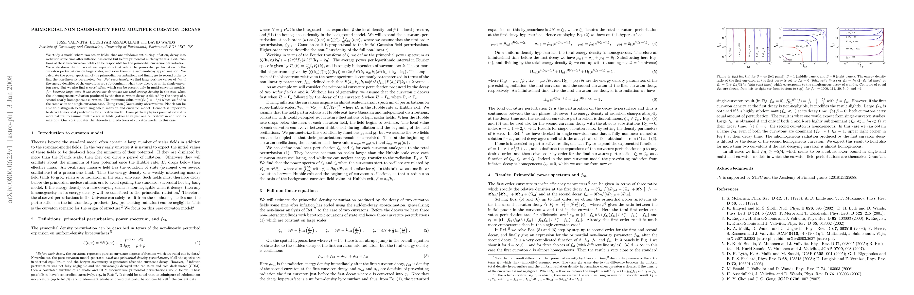 We study a model where two scalar fields, that are subdominant during inflation, decay into radiation some time after inflation has ended but before primordial nucleosynthesis. Perturbations of these two curvaton fields can be responsible for the primordial curvature perturbation. We write down the full non-linear equations that relate the primordial perturbation to the curvaton perturbations on large scales, and solve them in a sudden-decay approximation. We calculate the power spectrum of the primordial perturbation, and finally go to second order to find the non-linearity parameter, fNL. Not surprisingly, we find large positive values of fNL if the energy densities of the curvatons are sub-dominant when they decay, as in the single curvaton case. But we also find a novel effect, which can be present only in multi-curvaton models: fNL becomes large even if the curvatons dominate the total energy density in the case when the inhomogeneous radiation produced by the first curvaton decay is diluted by the decay of a second nearly homogeneous curvaton. The minimum value min(fNL)=-5/4 which we find is the same as in the single-curvaton case. Using (non-)Gaussianity observations, Planck can be able to distinguish between single-field inflation and curvaton model. Hence it is important to derive theoretical predictions for curvaton model. From particle physics point of view it is more natural to assume multiple scalar fields (rather than just one ``curvaton'' in addition to inflaton). Our work updates the theoretical predictions of curvaton model to this case.