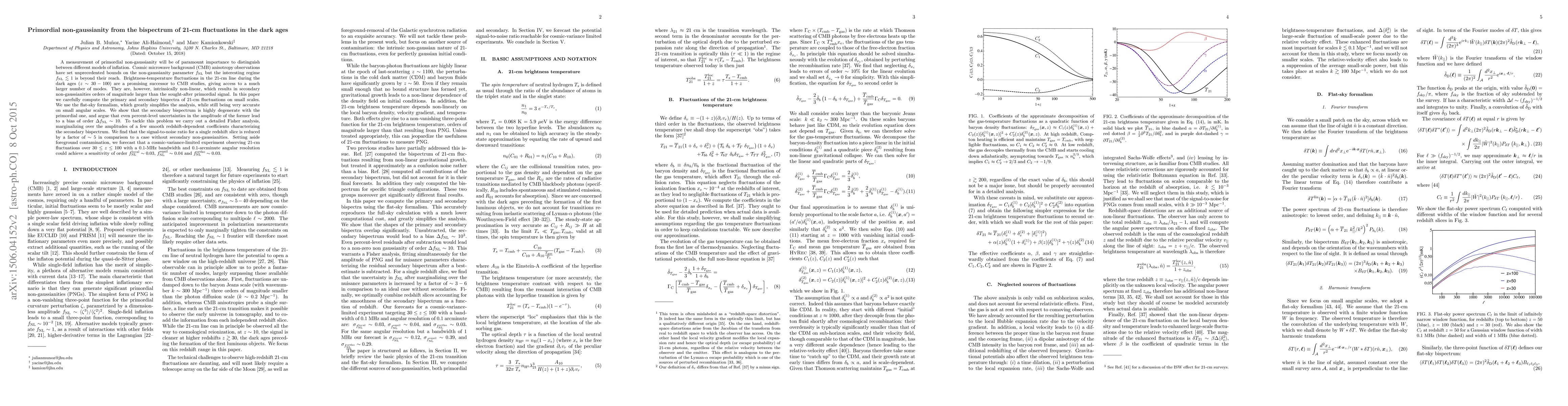 This paper explores the potential of 21-cm fluctuations during the dark ages to measure primordial non-Gaussianity, a key parameter for distinguishing inflation models. It finds that secondary non-Gaussianities from non-linear effects significantly bias measurements, but a detailed Fisher analysis suggests that with careful marginalization, a cosmic-variance-limited experiment could achieve sensitivities of f_NL ~ 0.03-0.04.