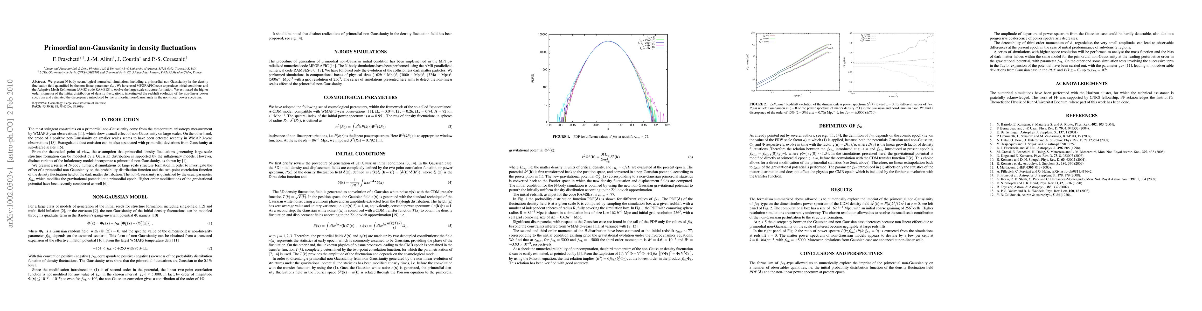 This paper uses N-body simulations to study the impact of primordial non-Gaussianity, quantified by $f_{NL}$, on density fluctuations, employing the MPGRAFIC and RAMSES codes. It investigates the evolution of the non-linear power spectrum and assesses the discrepancies introduced by non-Gaussianity.