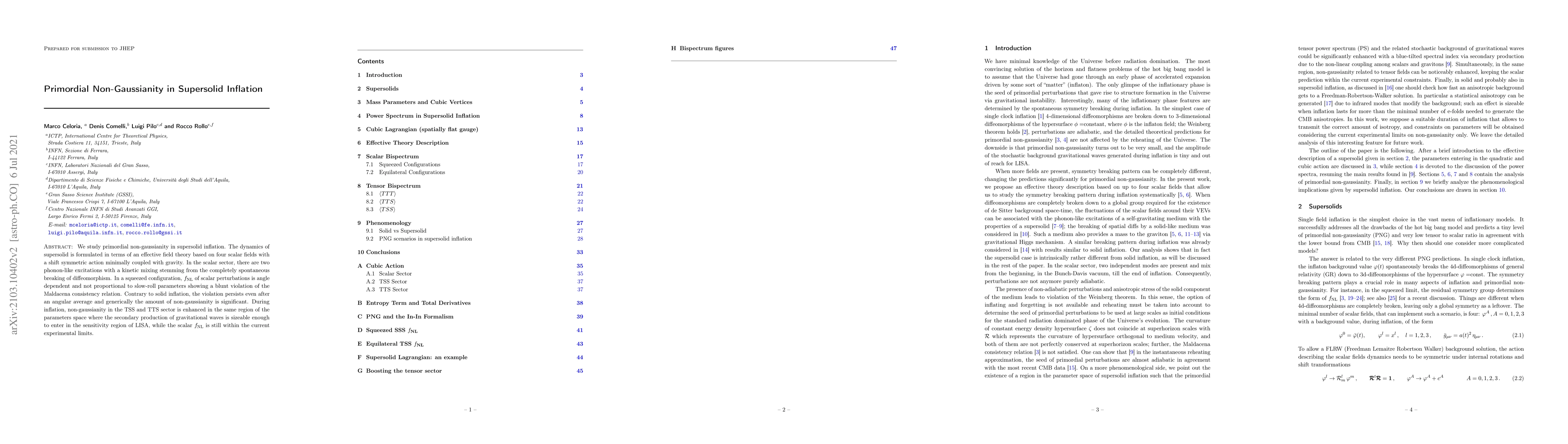 We study primordial non-gaussianity in supersolid inflation. The dynamics of supersolid is formulated in terms of an effective field theory based on four scalar fields with a shift symmetric action minimally coupled with gravity. In the scalar sector, there are two phonon-like excitations with a kinetic mixing stemming from the completely spontaneous breaking of diffeomorphism. In a squeezed configuration, $f_{\text{NL}}$ of scalar perturbations is angle dependent and not proportional to slow-roll parameters showing a blunt violation of the Maldacena consistency relation. Contrary to solid inflation, the violation persists even after an angular average and generically the amount of non-gaussianity is significant. During inflation, non-gaussianity in the TSS and TTS sector is enhanced in the same region of the parameters space where the secondary production of gravitational waves is sizeable enough to enter in the sensitivity region of LISA, while the scalar $f_{\text{NL}}$ is still within the current experimental limits.