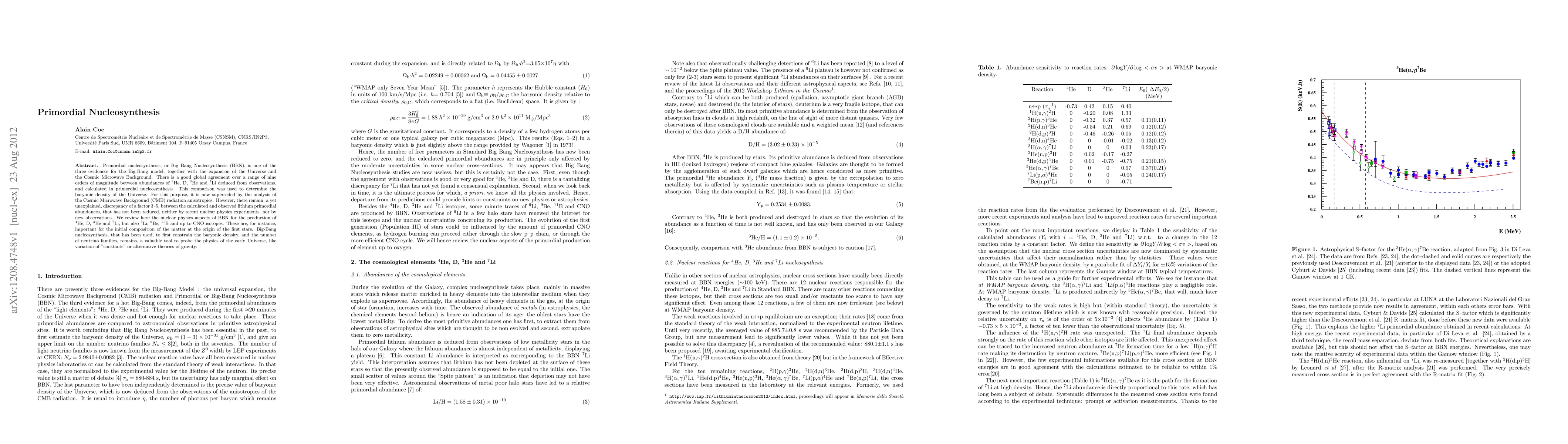 Primordial nucleosynthesis, or Big-Bang Nucleosynthesis (BBN), provides evidence for the Big-Bang model, with a strong agreement between observed and calculated abundances of light elements like 4He, D, and 7Li. However, a persistent discrepancy remains in the observed versus calculated lithium abundances, posing an unresolved challenge in nuclear physics.