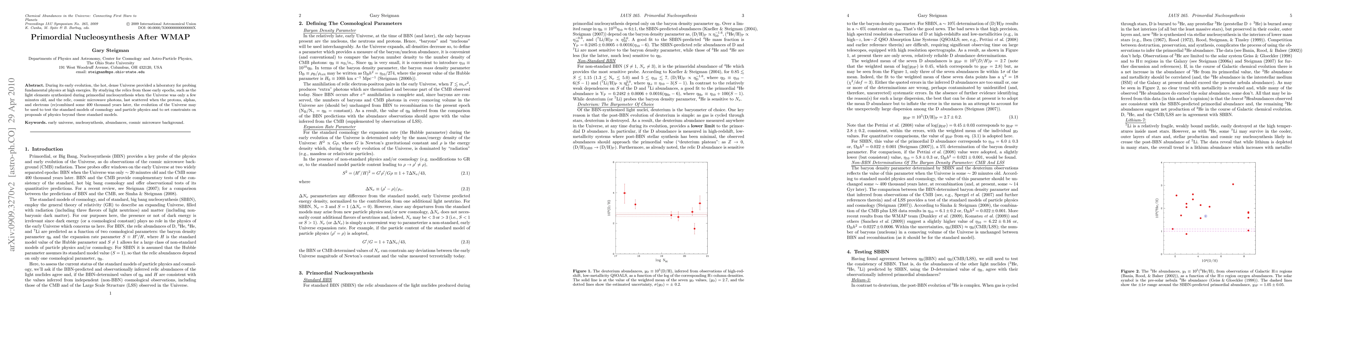 During its early evolution, the hot, dense Universe provided a laboratory for probing fundamental physics at high energies. By studying the relics from those early epochs, such as the light elements synthesized during primordial nucleosynthesis when the Universe was only a few minutes old, and the relic, cosmic microwave photons, last scattered when the protons, alphas, and electrons (re)combined some 400 thousand years later, the evolution of the Universe may be used to test the standard models of cosmology and particle physics and to set constraints on proposals of physics beyond these standard models.