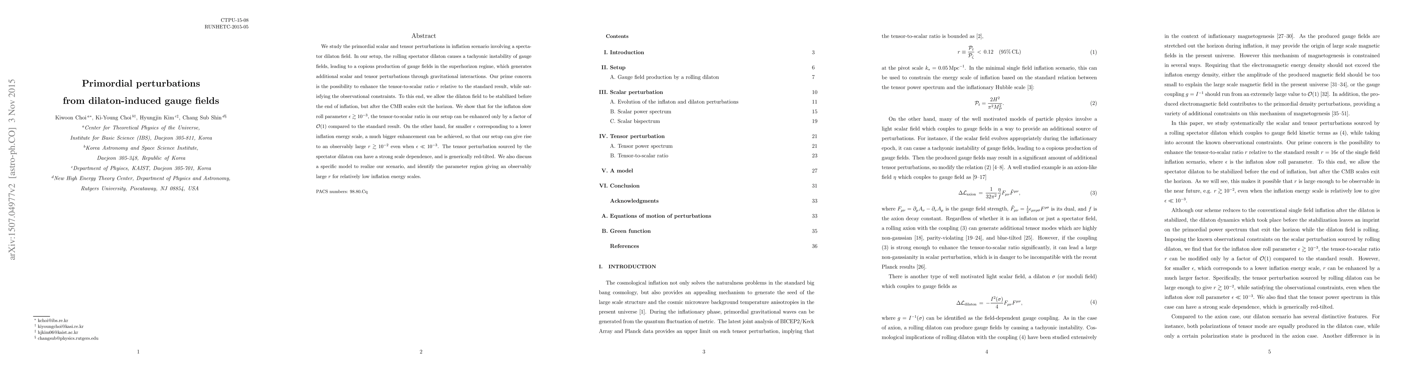 This paper investigates primordial perturbations in an inflationary scenario with a spectator dilaton field, where the dilaton's rolling induces a tachyonic instability in gauge fields, generating additional scalar and tensor perturbations. The study finds that while the tensor-to-scalar ratio can be enhanced by a factor of ${\cal O}(1)$ for typical slow roll parameters, smaller slow roll parameters allow for significantly larger enhancements, potentially yielding an observably large tensor-to-scalar ratio even at lower inflation energy scales.