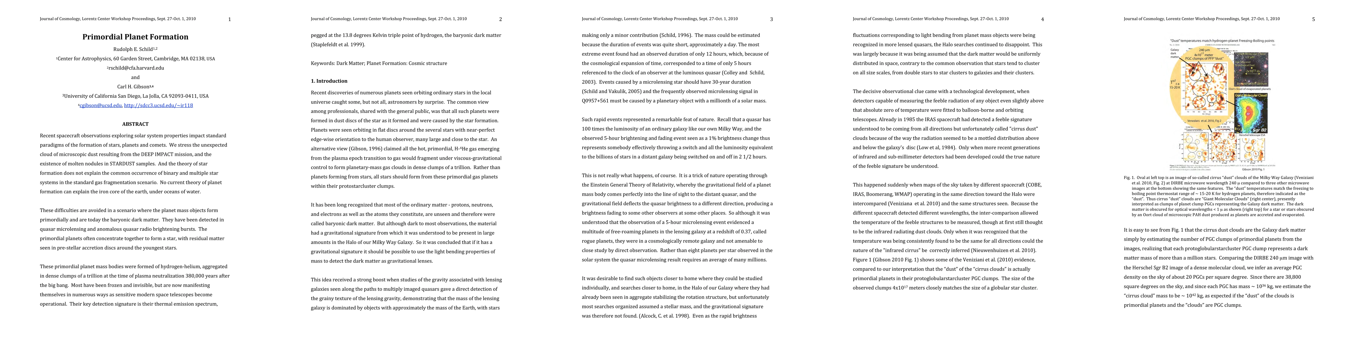 Recent spacecraft observations exploring solar system properties impact standard paradigms of the formation of stars, planets and comets. We stress the unexpected cloud of microscopic dust resulting from the DEEP IMPACT mission, and the existence of molten nodules in STARDUST samples. And the theory of star formation does not explain the common occurrence of binary and multiple star systems in the standard gas fragmentation scenario. No current theory of planet formation can explain the iron core of the earth, under oceans of water. These difficulties are avoided in a scenario where the planet mass objects form primordially and are today the baryonic dark matter. They have been detected in quasar microlensing and anomalous quasar radio brightening bursts. The primordial planets often concentrate together to form a star, with residual matter seen in pre-stellar accretion discs around the youngest stars. These primordial planet mass bodies were formed of hydrogen-helium, aggregated in dense clumps of a trillion at the time of plasma neutralization 380,000 years after the big bang. Most have been frozen and invisible, but are now manifesting themselves in numerous ways as sensitive modern space telescopes become operational. Their key detection signature is their thermal emission spectrum, pegged at the 13.8 degrees Kelvin triple point of hydrogen, the baryonic dark matter (Staplefeldt et al. 1999).