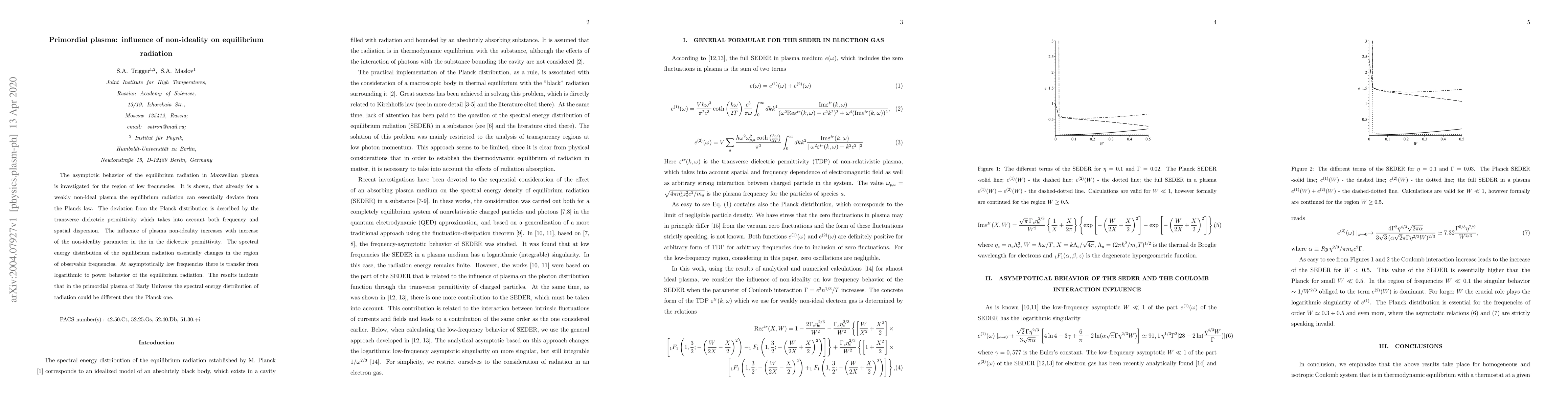 This paper investigates how non-ideality in primordial plasma affects equilibrium radiation, showing significant deviations from the Planck law due to frequency and spatial dispersion effects. The study concludes that the spectral energy distribution of radiation in early universe plasma could differ from the Planck distribution.