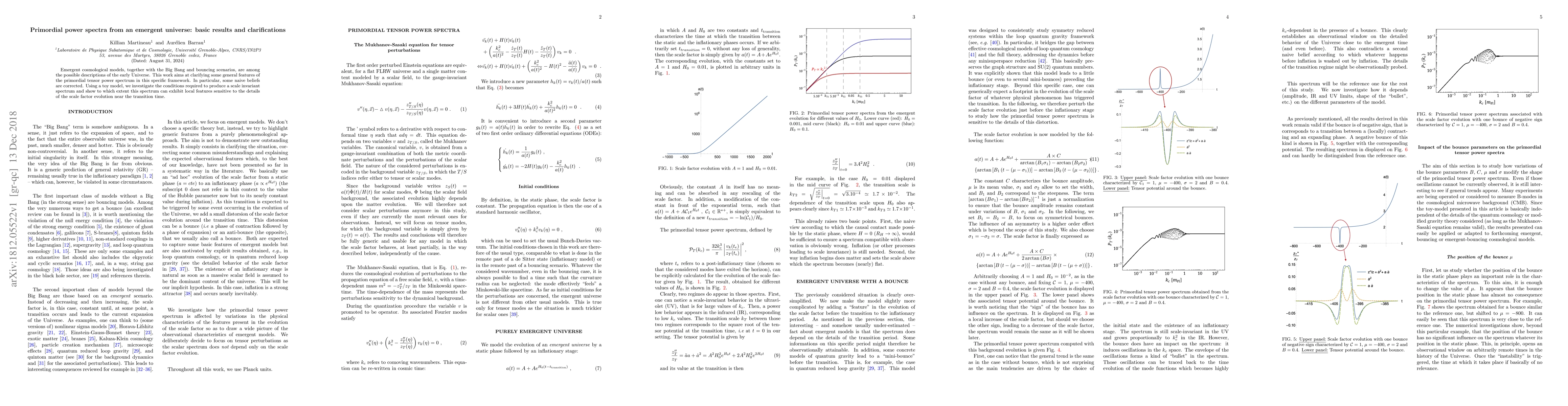 This research paper explores emergent universe models, clarifying features of primordial tensor power spectra and correcting naive beliefs. It investigates conditions for scale-invariant spectra and local features sensitive to the transition time in these models.
