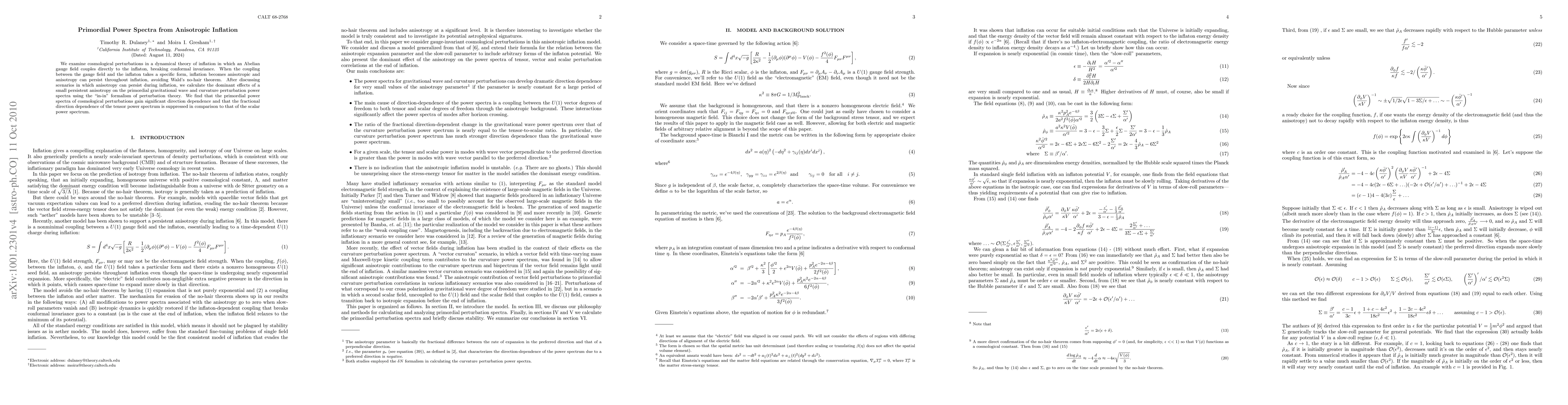 We examine cosmological perturbations in a dynamical theory of inflation in which an Abelian gauge field couples directly to the inflaton, breaking conformal invariance. When the coupling between the gauge field and the inflaton takes a specific form, inflation becomes anisotropic and anisotropy can persist throughout inflation, avoiding Wald's no-hair theorem. After discussing scenarios in which anisotropy can persist during inflation, we calculate the dominant effects of a small persistent anisotropy on the primordial gravitational wave and curvature perturbation power spectra using the "in-in" formalism of perturbation theory. We find that the primordial power spectra of cosmological perturbations gain significant direction dependence and that the fractional direction dependence of the tensor power spectrum is suppressed in comparison to that of the scalar power spectrum.