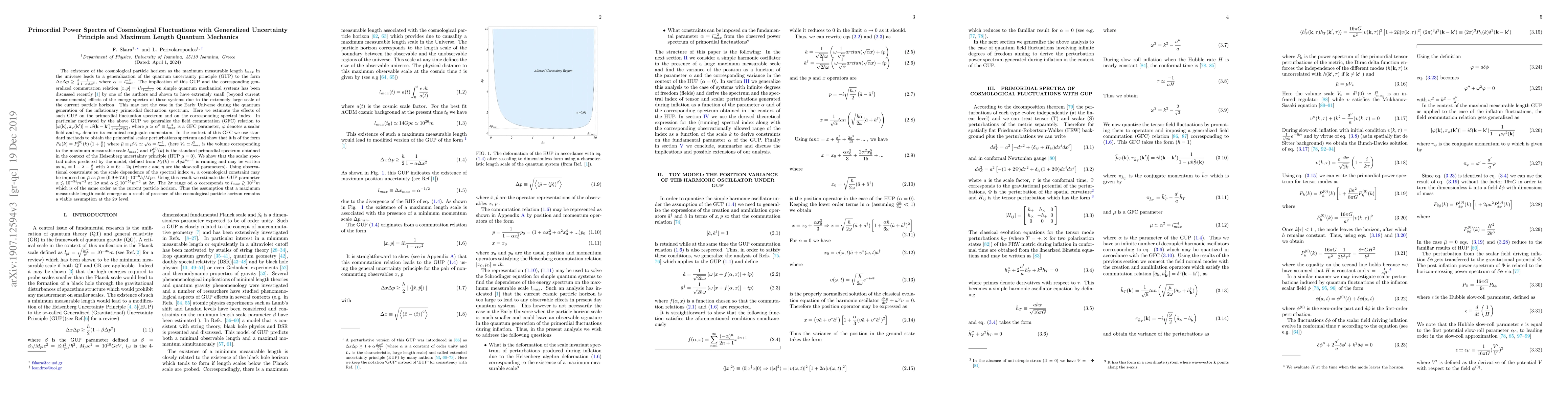 The existence of the cosmological particle horizon as the maximum measurable length $l_{max}$ in the universe leads to a generalization of the quantum uncertainty principle (GUP) to the form $\Delta x \Delta p \geq \frac{\hbar}{2}\frac{1}{1-\alpha\Delta x^2} $, where $\alpha\equiv l_{max}^{-2}$. The effects of this GUP on simple quantum mechanical systems has been shown recently by one of the authors\cite{Perivolaropoulos:2017rgq} to be extremely small (beyond current measurements) due to the extremely large scale of the current particle horizon. This is not the case in the Early Universe during the quantum generation of the inflationary primordial fluctuation spectrum. We estimate the effects of such GUP on the primordial fluctuation spectrum and on the corresponding spectral index. We generalize the field commutation (GFC) relation to $[\varphi(k),\pi_{\varphi}(k')]$=$i\delta(k-k')\frac{1}{1-\mu\varphi^2(k)}$, where $\mu\sim \alpha^2\equiv l_{max}^{-4}$ is a GFC parameter, $\varphi$ denotes a scalar field and $\pi_{\varphi}$ denotes its canonical conjugate momentum. We obtain the predicted primordial perturbation spectrum as $P_S(k)=P_S^{(0)}(k)\left(1+\frac{\bar{\mu}}{k}\right)$ where $\bar{\mu}\equiv\mu V_* \simeq \sqrt{\alpha}= l_{max}^{-1}$ (here $V_*\simeq l_{max}^3$ is the volume corresponding to $l_{max}$) and $P_S^{(0)}(k)$ is the standard primordial spectrum obtained in the context of the Heisenberg uncertainty principle ($\mu=0$). We show that the predicted scalar spectral index is $n_s=1-\lambda-\frac{\bar{\mu}}{k}$ where $\lambda$ is a slow-roll parameter. Using observational constraints on the scale dependence of the spectral index $n_s$ we show that the $2\sigma$ range of $\alpha$ corresponds to $l_{max}\gtrsim 10^{26} m $ which is of the same order as the current particle horizon.