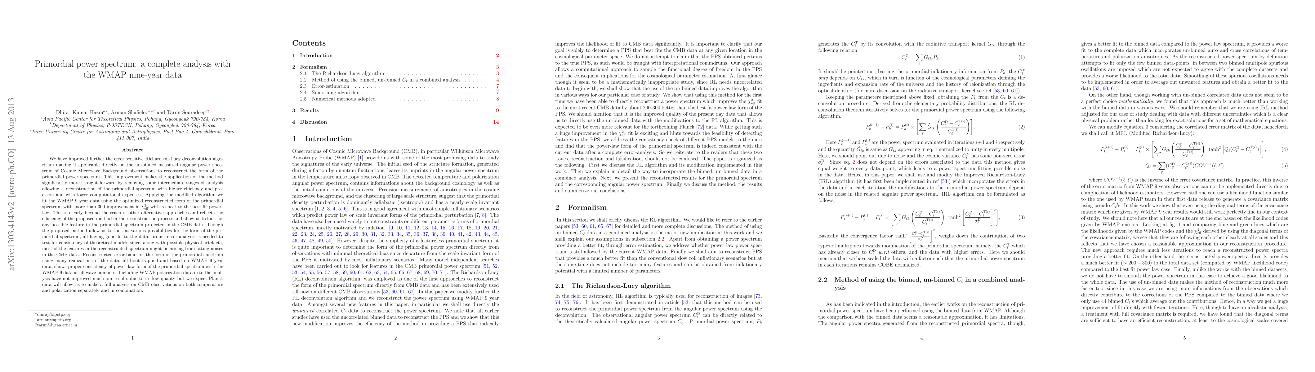 We have improved further the error sensitive Richardson-Lucy deconvolution algorithm making it applicable directly on the un-binned measured angular power spectrum of Cosmic Microwave Background observations to reconstruct the form of the primordial power spectrum. This improvement makes the application of the method significantly more straight forward by removing some intermediate stages of analysis allowing a reconstruction of the primordial spectrum with higher efficiency and precision and with lower computational expenses. Applying the modified algorithm we fit the WMAP 9 year data using the optimized reconstructed form of the primordial spectrum with more than 300 improvement in \chi^2 with respect to the best fit power-law. This is clearly beyond the reach of other alternative approaches and reflects the efficiency of the proposed method in the reconstruction process and allow us to look for any possible feature in the primordial spectrum projected in the CMB data. Though the proposed method allow us to look at various possibilities for the form of the primordial spectrum, all having good fit to the data, proper error-analysis is needed to test for consistency of theoretical models since, along with possible physical artefacts, most of the features in the reconstructed spectrum might be arising from fitting noises in the CMB data. Reconstructed error-band for the form of the primordial spectrum using many realizations of the data, all bootstrapped and based on WMAP 9 year data, shows proper consistency of power-law form of the primordial spectrum with the WMAP 9 data at all wave numbers. Including WMAP polarization data in to the analysis have not improved much our results due to its low quality but we expect Planck data will allow us to make a full analysis on CMB observations on both temperature and polarization separately and in combination.