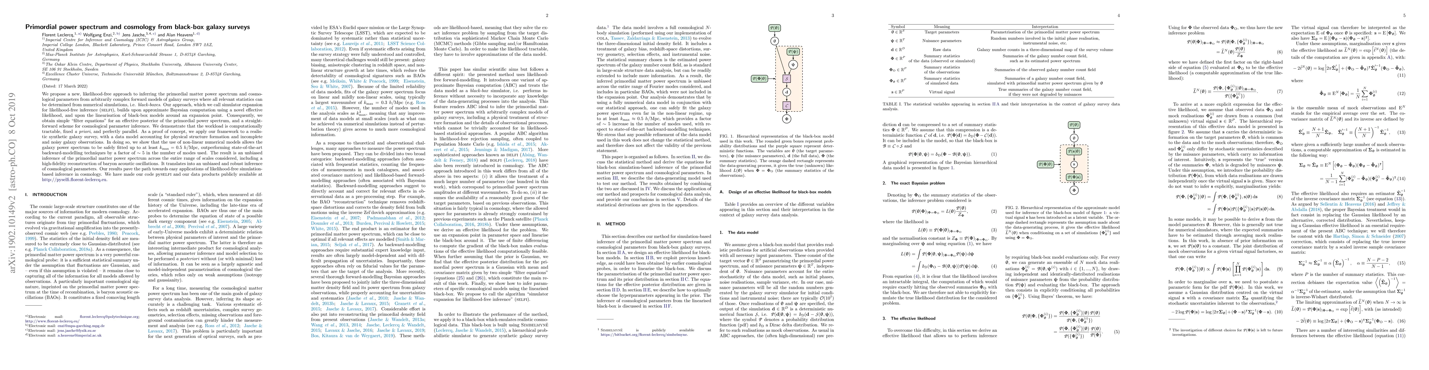 This paper introduces SELFI, a novel likelihood-free method for inferring the primordial matter power spectrum and cosmological parameters from complex galaxy surveys using black-box models. The method, which employs simulator expansion and approximate Bayesian computation, allows for efficient and accurate inference without the need for traditional likelihood calculations, demonstrating superior performance over existing techniques.