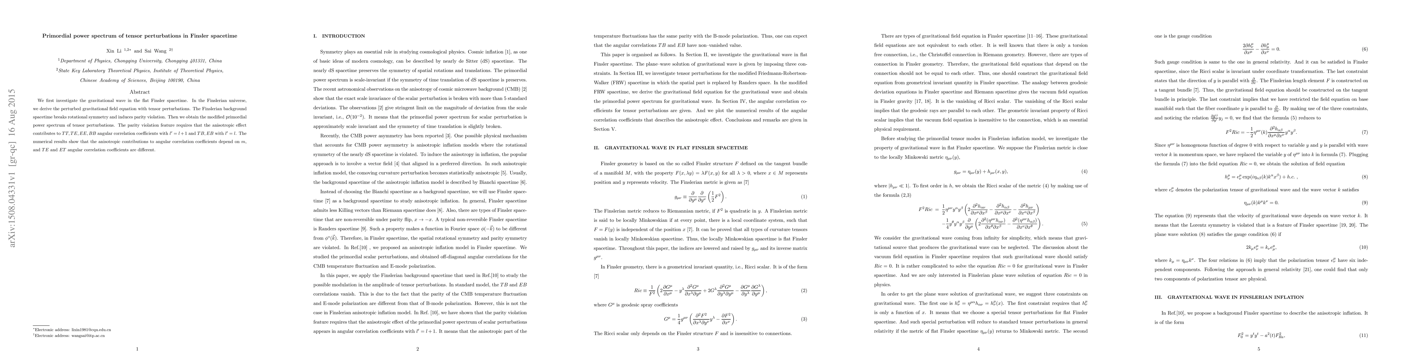 We first investigate the gravitational wave in the flat Finsler spacetime. In the Finslerian universe, we derive the perturbed gravitational field equation with tensor perturbations. The Finslerian background spacetime breaks rotational symmetry and induces parity violation. Then we obtain the modified primordial power spectrum of tensor perturbations. The parity violation feature requires that the anisotropic effect contributes to $TT,TE,EE,BB$ angular correlation coefficients with $l'=l+1$ and $TB,EB$ with $l'=l$. The numerical results show that the anisotropic contributions to angular correlation coefficients depend on $m$, and $TE$ and $ET$ angular correlation coefficients are different.
