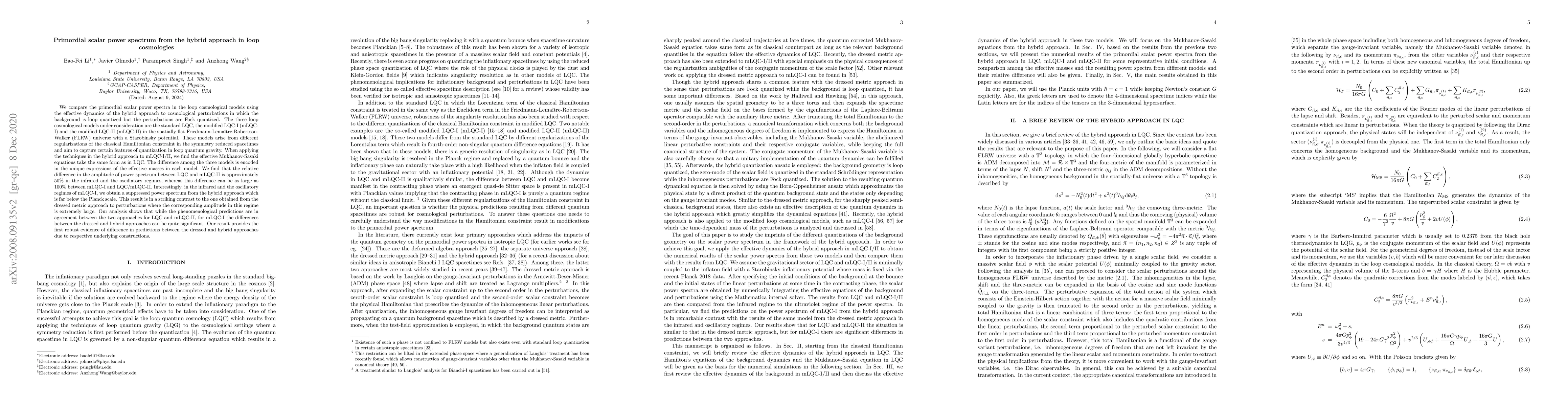 This paper compares the primordial scalar power spectra in three loop cosmological models using the hybrid approach, finding that while LQC and modified LQC-II show similar results, modified LQC-I significantly differs, especially in the infrared and oscillatory regimes where the power spectrum is suppressed below the Planck scale, contrasting with predictions from the dressed metric approach.