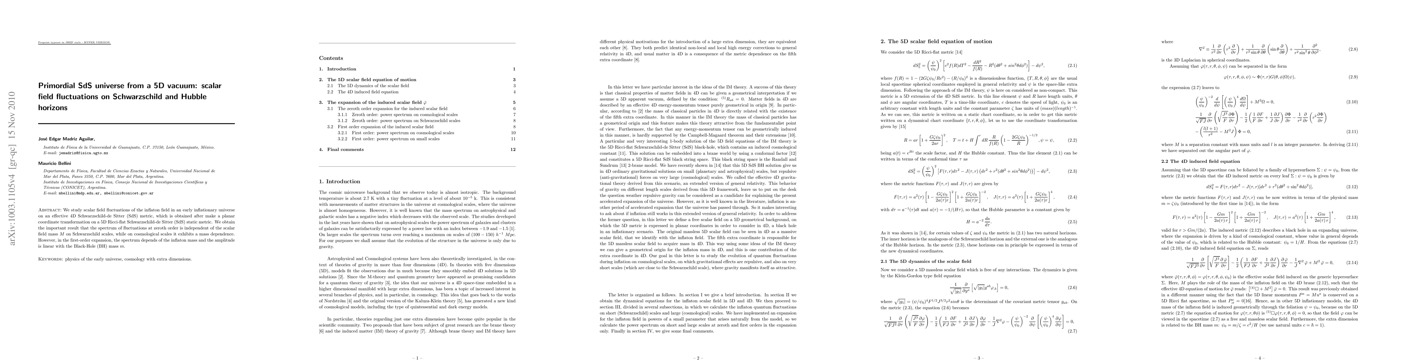 This paper investigates scalar field fluctuations in an early inflationary universe derived from a 5D vacuum, focusing on a 4D Schwarzschild-de Sitter metric. The study finds that zeroth-order fluctuation spectra are independent of the scalar field mass on Schwarzschild scales but mass-dependent on cosmological scales, while first-order fluctuations depend on the inflaton mass and are linearly proportional to the Black-Hole mass.