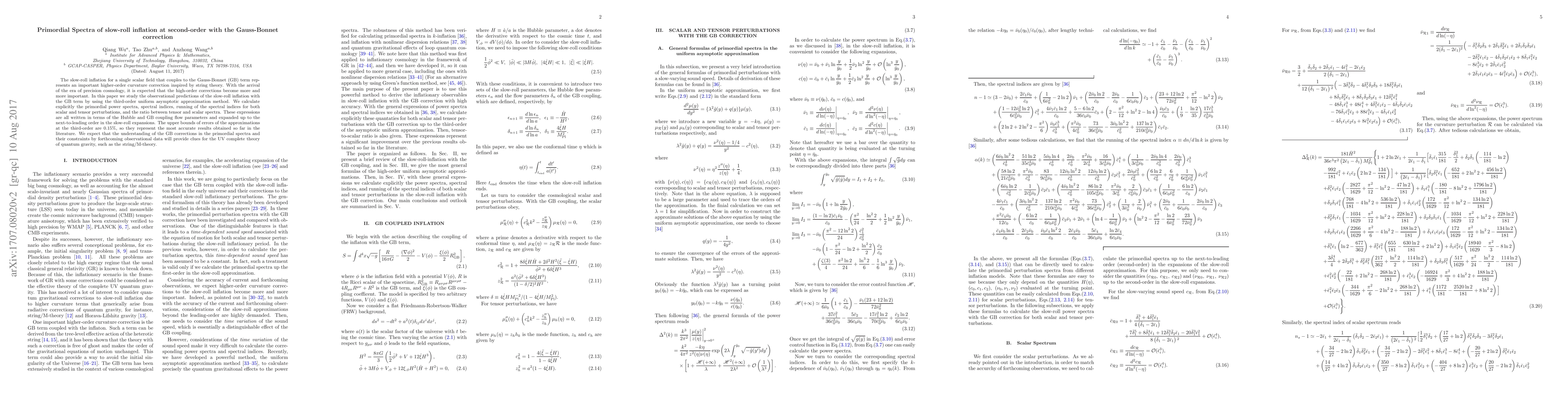 This paper investigates the primordial spectra of slow-roll inflation incorporating the Gauss-Bonnet correction, using third-order uniform asymptotic approximation. It provides precise predictions for scalar and tensor perturbations, aiming to shed light on higher-order curvature corrections and their implications for quantum gravity theories.