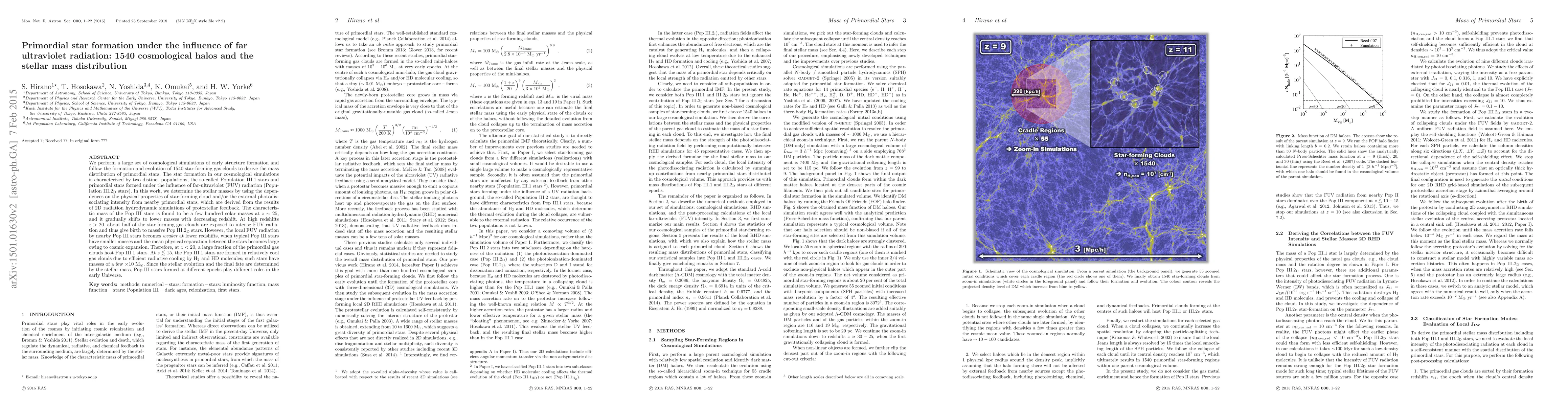 This research investigates the formation and mass distribution of primordial stars in 1540 cosmological halos, identifying two distinct populations: massive Population III.1 stars and smaller Pop III.2D stars influenced by far ultraviolet radiation. The study finds that at high redshifts, intense FUV radiation leads to the formation of massive stars, while lower redshifts see a shift towards smaller, cooler stars due to weaker local FUV radiation and cosmic expansion.