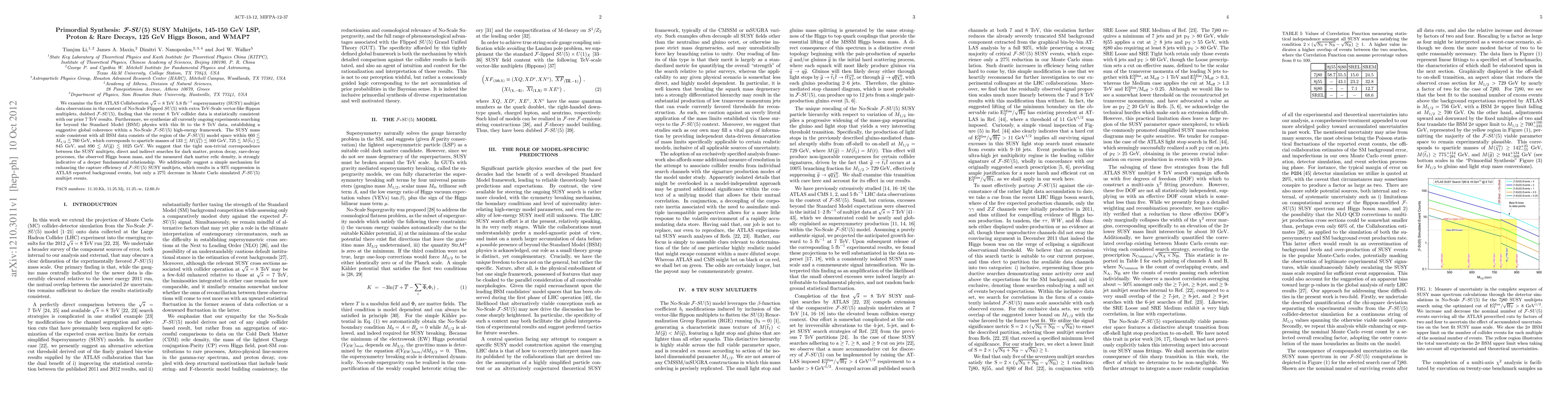 We examine the first ATLAS Collaboration 8 TeV 5.8/fb supersymmetry (SUSY) multijet data observations in the context of No-Scale Flipped SU(5) with extra TeV-Scale vector-like flippon multiplets, dubbed F-SU(5), finding that the recent 8 TeV collider data is statistically consistent with our prior 7 TeV results. Furthermore, we synthesize all currently ongoing experiments searching for beyond the Standard Model (BSM) physics with this fit to the 8 TeV data, establishing a suggestive global coherence within a No-Scale F-SU(5) high-energy framework. The SUSY mass scale consistent with all BSM data consists of the region of the F-SU(5) model space within 660 ~< M_{1/2} ~< 760 GeV, which corresponds to sparticle masses of 133 ~< M(chi_1^0) ~< 160 GeV, 725 ~< M(t_1) ~< 845 GeV, and 890 ~< M(g) ~< 1025 GeV. We suggest that the tight non-trivial correspondence between the SUSY multijets, direct and indirect searches for dark matter, proton decay, rare-decay processes, the observed Higgs boson mass, and the measured dark matter relic density, is strongly indicative of a deeper fundamental relationship. We additionally suggest a simple mechanism for enhancing the capture efficiency of F-SU(5) SUSY multijets, which results in a 93% suppression in ATLAS reported background events, but only a 27% decrease in Monte Carlo simulated F-SU(5) multijet events.