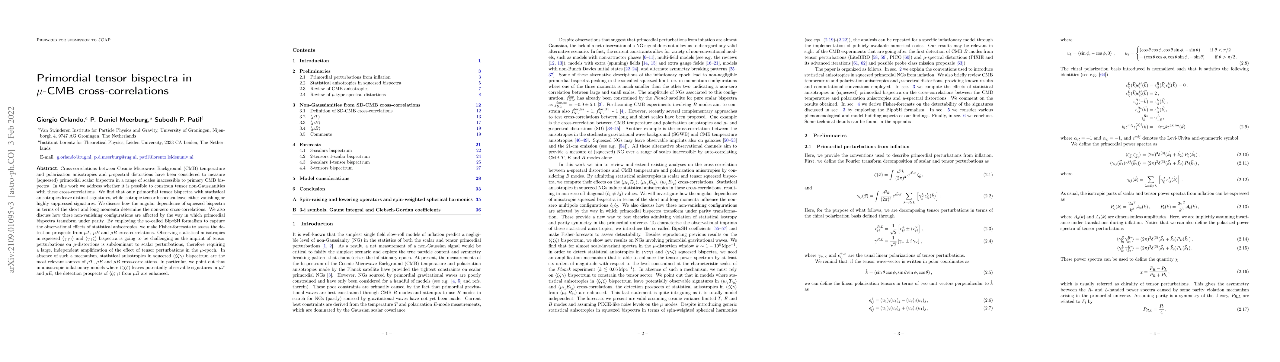 Cross-correlations between Cosmic Microwave Background (CMB) temperature and polarization anisotropies and $\mu$-spectral distortions have been considered to measure (squeezed) primordial scalar bispectra in a range of scales inaccessible to primary CMB bispectra. In this work we address whether it is possible to constrain tensor non-Gaussianities with these cross-correlations. We find that only primordial tensor bispectra with statistical anisotropies leave distinct signatures, while isotropic tensor bispectra leave either vanishing or highly suppressed signatures. We discuss how the angular dependence of squeezed bispectra in terms of the short and long momenta determine the non-zero cross-correlations. We also discuss how these non-vanishing configurations are affected by the way in which primordial bispectra transform under parity. By employing the so-called BipoSH formalism to capture the observational effects of statistical anisotropies, we make Fisher-forecasts to assess the detection prospects from $\mu T$, $\mu E$ and $\mu B$ cross-correlations. Observing statistical anisotropies in squeezed $\langle \gamma \gamma \gamma\rangle$ and $\langle \gamma \gamma \zeta\rangle$ bispectra is going to be challenging as the imprint of tensor perturbations on $\mu$-distortions is subdominant to scalar perturbations, therefore requiring a large, independent amplification of the effect of tensor perturbations in the $\mu$-epoch. In absence of such a mechanism, statistical anisotropies in squeezed $\langle \zeta \zeta \gamma\rangle$ bispectrum are the most relevant sources of $\mu T$, $\mu E$ and $\mu B$ cross-correlations. In particular, we point out that in anisotropic inflationary models where $\langle \zeta \zeta \zeta \rangle$ leaves potentially observable signatures in $\mu T$ and $\mu E$, the detection prospects of $\langle \zeta \zeta \gamma\rangle$ from $\mu B$ are enhanced.