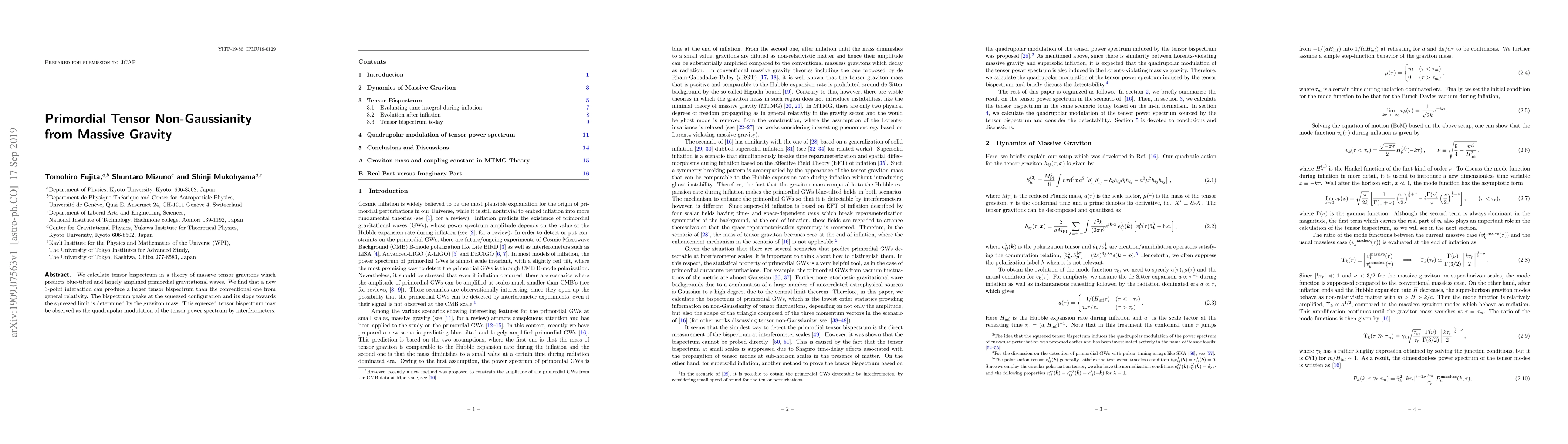 This paper investigates tensor bispectrum in massive gravity theory, predicting amplified primordial gravitational waves with a blue tilt. It finds that a new 3-point interaction can generate a larger tensor bispectrum than in general relativity, with the bispectrum's squeezed configuration slope determined by graviton mass, potentially observable as quadrupolar modulation by interferometers.