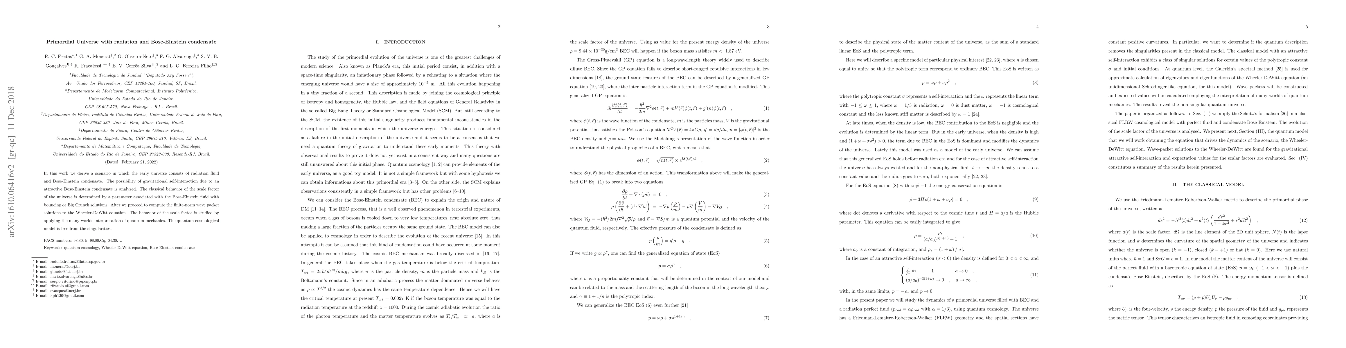 This paper explores a primordial universe model comprising radiation fluid and Bose-Einstein condensate, analyzing gravitational self-interactions and deriving bouncing or Big Crunch solutions. It also computes finite-norm wave packet solutions to the Wheeler-DeWitt equation, concluding that the quantum cosmological model avoids singularities through the many-worlds interpretation.