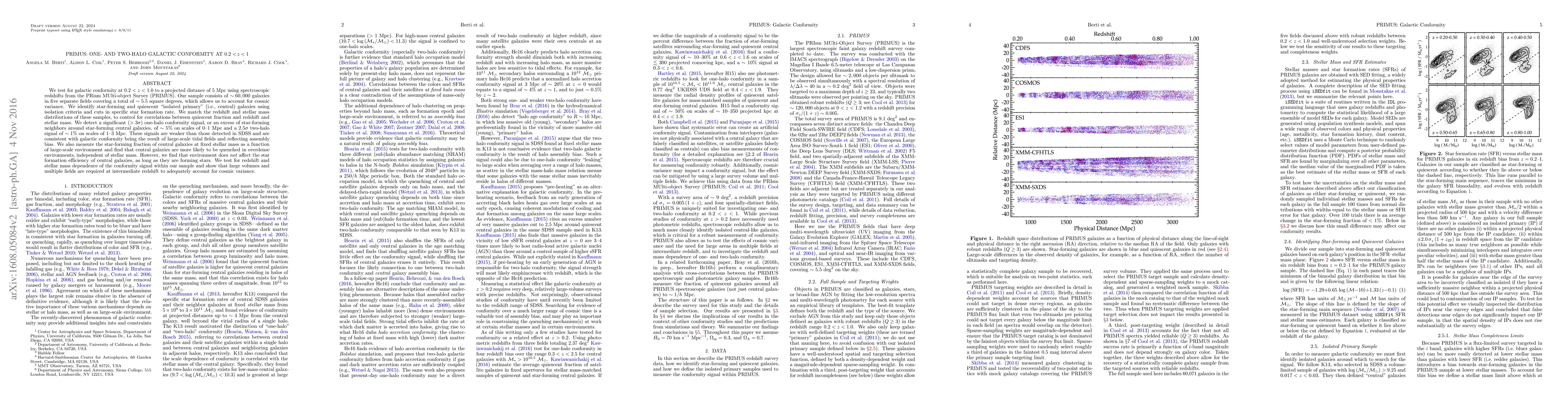 This study investigates galactic conformity in the redshift range $0.2 < z < 1.0$ using data from the PRIMUS survey, revealing a significant one-halo conformity signal of ~5% around star-forming central galaxies and a weaker two-halo signal of ~1%. The findings suggest that galactic conformity is influenced by large-scale tidal fields and assembly bias.