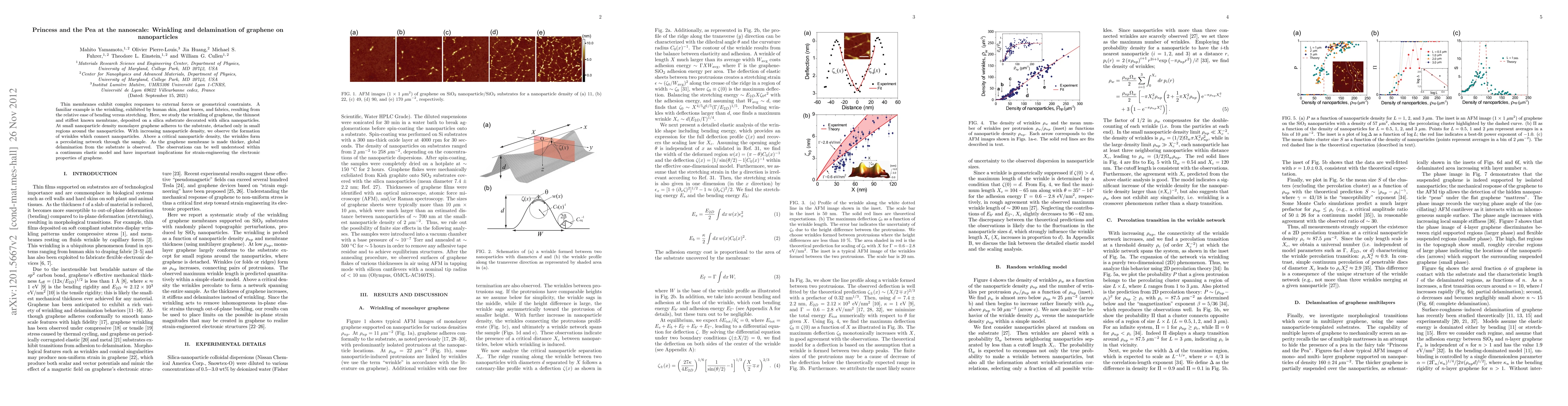 This paper investigates the wrinkling and delamination behavior of graphene on silica substrates with nanoparticles, revealing how increasing nanoparticle density leads to wrinkle formation and eventual global delamination, which can be modeled using continuum elastic theory and has implications for engineering graphene's electronic properties.