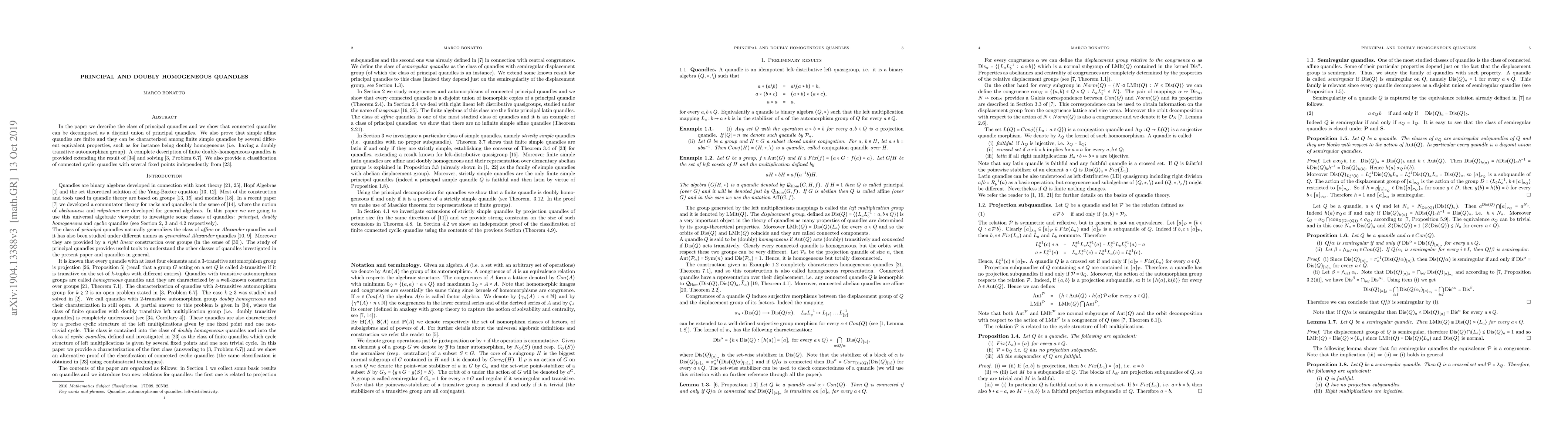 The paper classifies principal and doubly homogeneous quandles, demonstrating that connected quandles decompose into principal quandles. It proves that simple affine quandles are finite and doubly homogeneous, providing a complete description of such quandles and classifying connected cyclic quandles with fixed points.