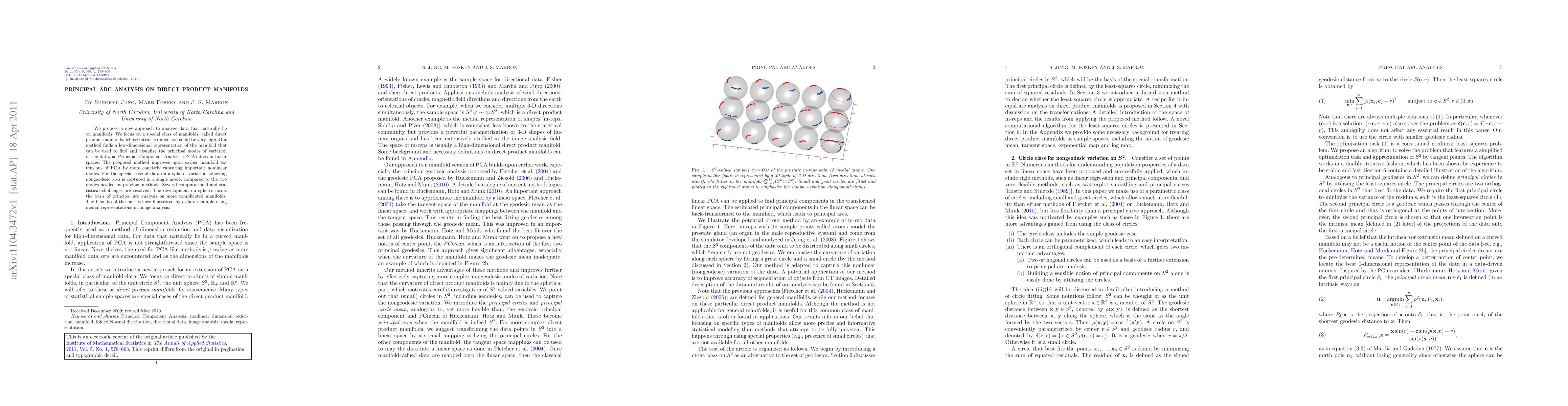 We propose a new approach to analyze data that naturally lie on manifolds. We focus on a special class of manifolds, called direct product manifolds, whose intrinsic dimension could be very high. Our method finds a low-dimensional representation of the manifold that can be used to find and visualize the principal modes of variation of the data, as Principal Component Analysis (PCA) does in linear spaces. The proposed method improves upon earlier manifold extensions of PCA by more concisely capturing important nonlinear modes. For the special case of data on a sphere, variation following nongeodesic arcs is captured in a single mode, compared to the two modes needed by previous methods. Several computational and statistical challenges are resolved. The development on spheres forms the basis of principal arc analysis on more complicated manifolds. The benefits of the method are illustrated by a data example using medial representations in image analysis.