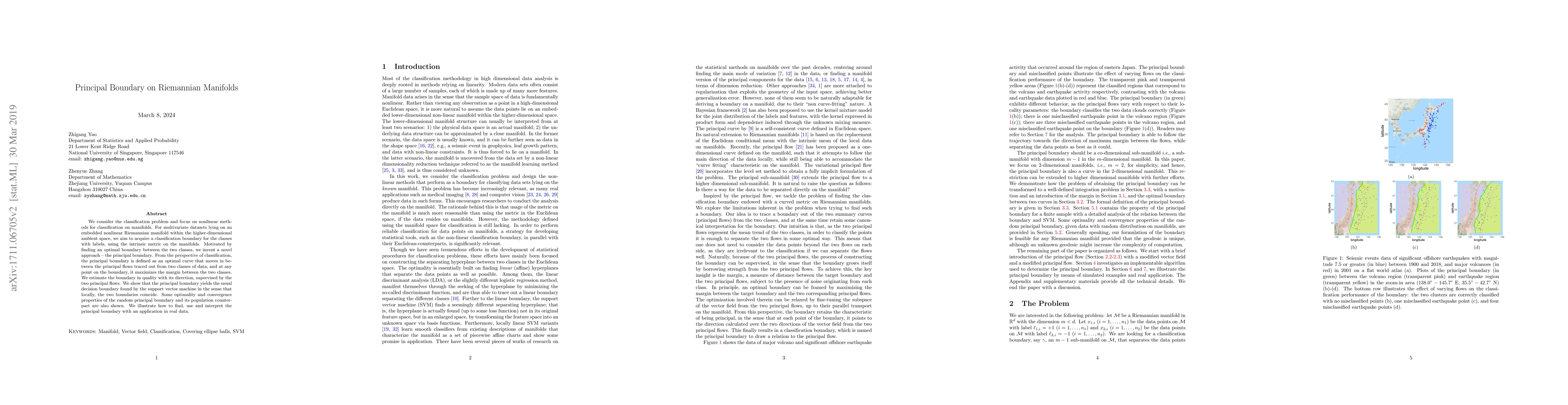 A novel approach called principal boundary is introduced for classification on nonlinear Riemannian manifolds, aiming to find an optimal curve that maximizes the margin between two classes of data. The method yields a decision boundary similar to support vector machines, with optimality and convergence properties shown.