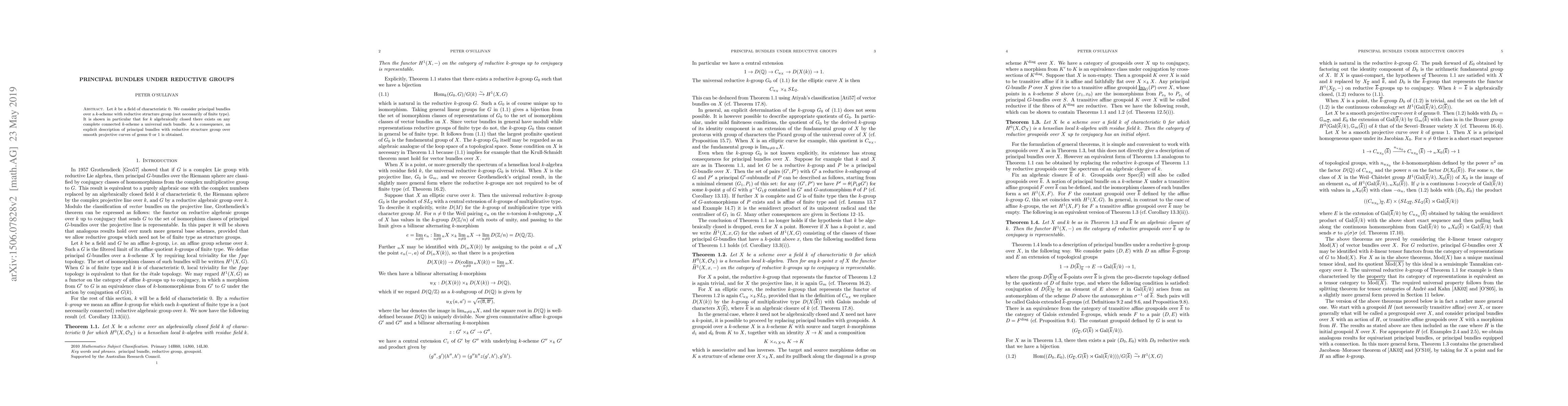 This research paper explores principal bundles over complete connected schemes with reductive structure groups, showing a universal bundle exists for algebraically closed fields, leading to explicit descriptions of principal bundles on curves of genus 0 or 1.