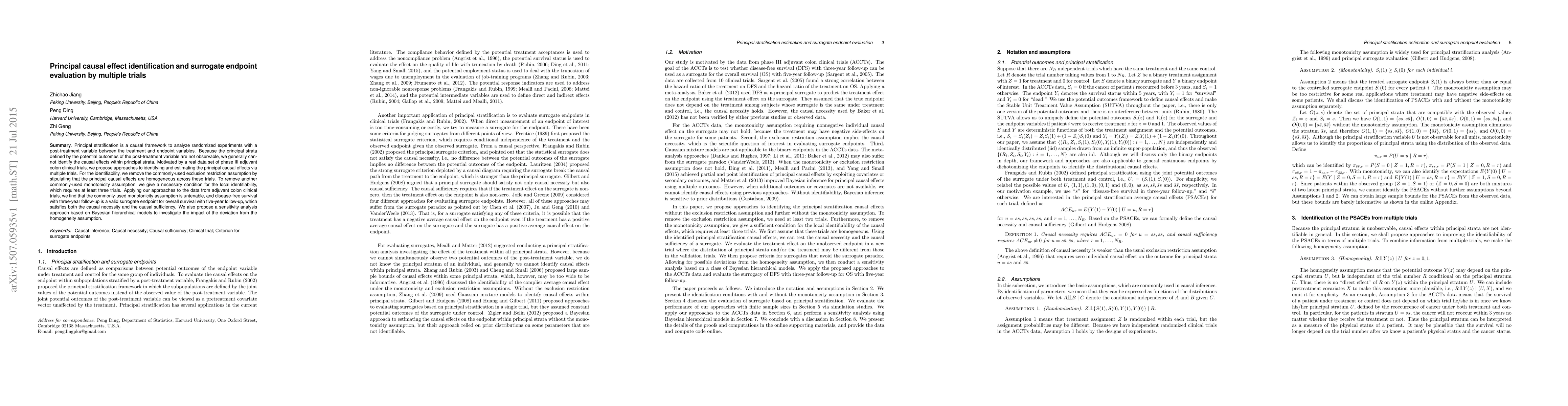 Principal stratification is a causal framework to analyze randomized experiments with a post-treatment variable between the treatment and endpoint variables. Because the principal strata defined by the potential outcomes of the post-treatment variable are not observable, we generally cannot identify the causal effects within principal strata. Motivated by a real data set of phase III adjuvant colon clinical trials, we propose approaches to identifying and estimating the principal causal effects via multiple trials. For the identifiability, we remove the commonly-used exclusion restriction assumption by stipulating that the principal causal effects are homogeneous across these trials. To remove another commonly-used monotonicity assumption, we give a necessary condition for the local identifiability, which requires at least three trials. Applying our approaches to the data from adjuvant colon clinical trials, we find that the commonly-used monotonicity assumption is untenable, and disease-free survival with three-year follow-up is a valid surrogate endpoint for overall survival with five-year follow-up, which satisfies both the causal necessity and the causal sufficiency. We also propose a sensitivity analysis approach based on Bayesian hierarchical models to investigate the impact of the deviation from the homogeneity assumption.