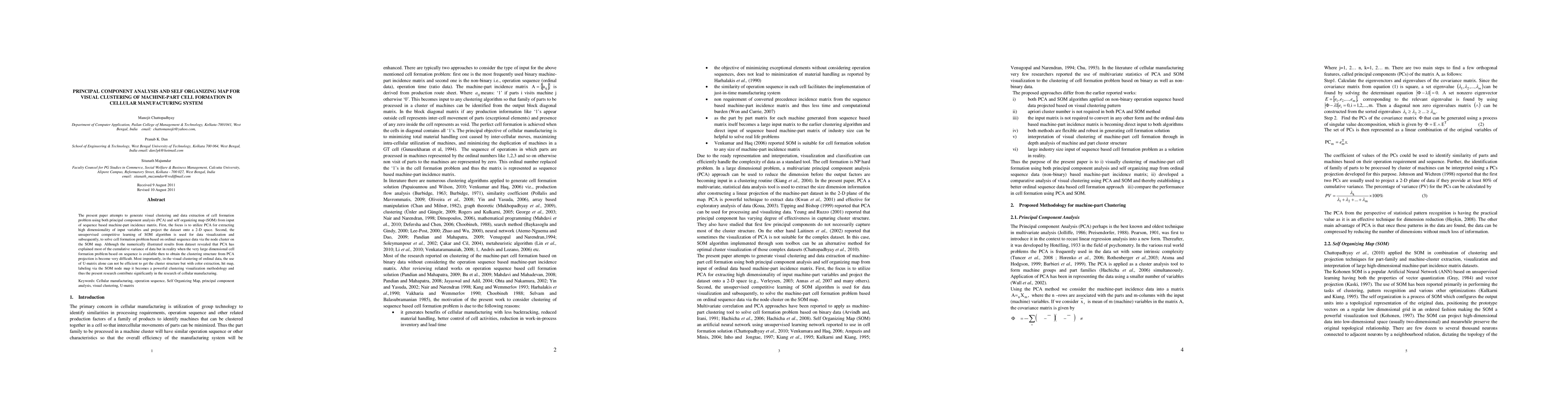 This paper combines PCA and SOM to visually cluster and solve machine-part cell formation in cellular manufacturing. PCA reduces high dimensionality to 2D, while SOM provides visual clustering and data extraction, enhancing the visualization of ordinal sequence data.