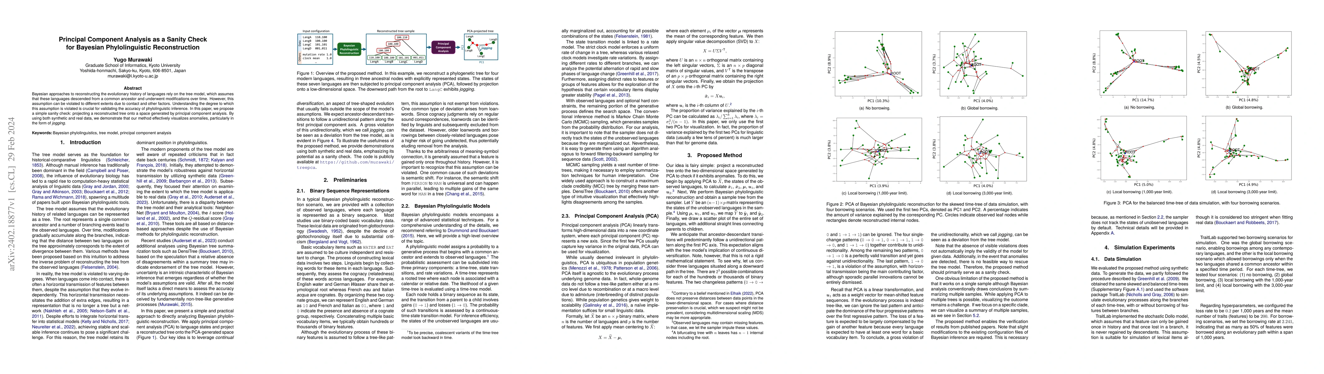 This paper proposes using principal component analysis (PCA) as a sanity check for Bayesian phylolinguistic reconstructions, which assume language evolution from a common ancestor. The authors demonstrate that PCA can visualize anomalies like "jogging" in language trees, validating the method with both synthetic and real data.