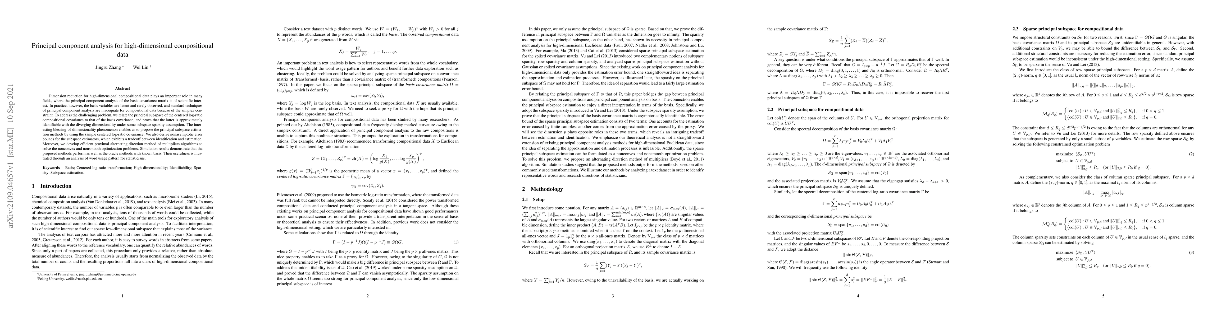 The research uses principal component analysis for high-dimensional compositional data, relating the principal subspace of the centered log-ratio compositional covariance to that of the basis covariance.