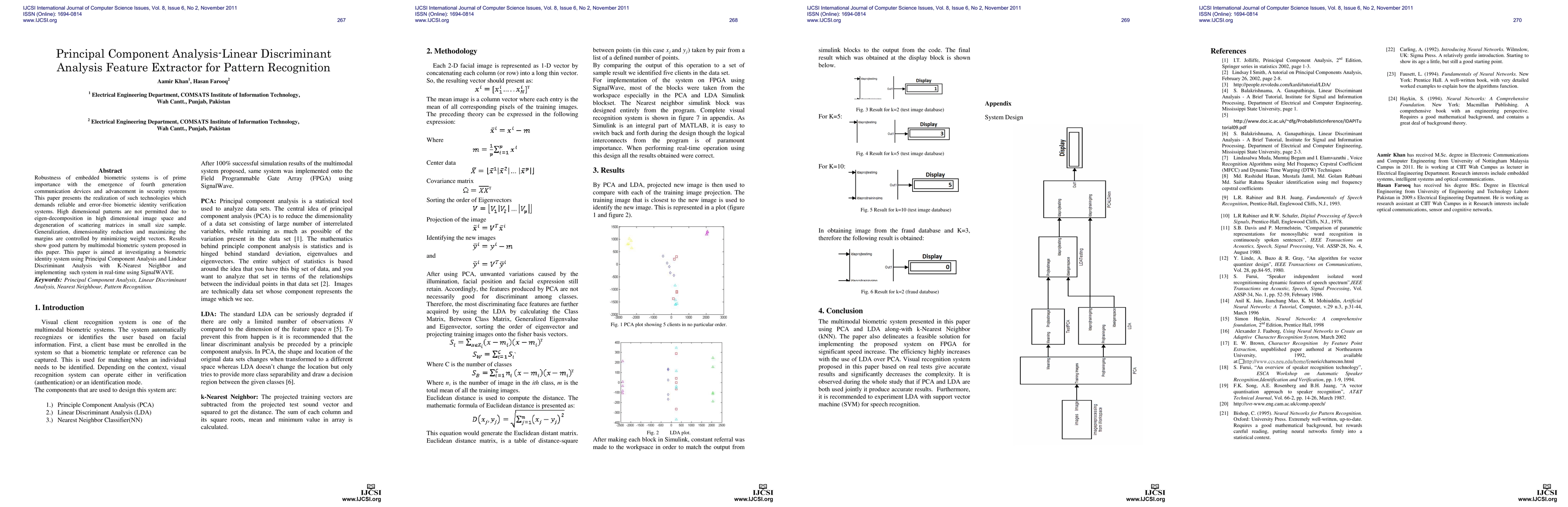 Robustness of embedded biometric systems is of prime importance with the emergence of fourth generation communication devices and advancement in security systems This paper presents the realization of such technologies which demands reliable and error-free biometric identity verification systems. High dimensional patterns are not permitted due to eigen-decomposition in high dimensional image space and degeneration of scattering matrices in small size sample. Generalization, dimensionality reduction and maximizing the margins are controlled by minimizing weight vectors. Results show good pattern by multimodal biometric system proposed in this paper. This paper is aimed at investigating a biometric identity system using Principal Component Analysis and Lindear Discriminant Analysis with K-Nearest Neighbor and implementing such system in real-time using SignalWAVE.