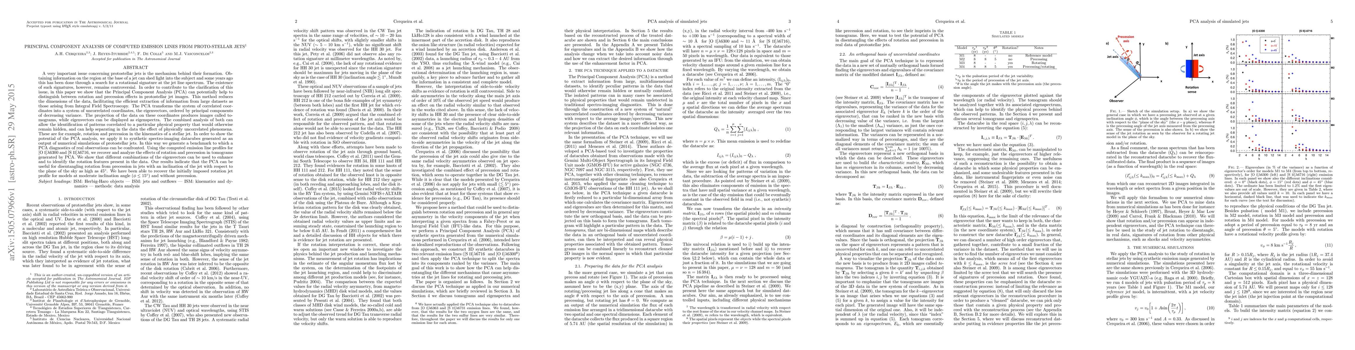 A very important issue concerning protostellar jets is the mechanism behind their formation. Obtaining information on the region at the base of a jet can shed light into the subject and some years ago this has been done through a search for a rotational signature at the jet line spectrum. The existence of such signatures, however, remains controversial. In order to contribute to the clarification of this issue, in this paper we show that the Principal Component Analysis (PCA) can potentially help to distinguish between rotation and precession effects in protostellar jet images. We apply the PCA to synthetic spectro-imaging datacubes generated as an output of numerical simulations of protostellar jets. In this way we generate a benchmark to which a PCA diagnostics of real observations can be confronted. Using the computed emission line profiles for [O I]6300A and [S II]6716A, we recover and analyze the effects of rotation and precession in tomograms generated by PCA. We show that different combinations of the eigenvectors can be used to enhance and to identify the rotation features present in the data. Our results indicate that the PCA can be useful for disentangling rotation from precession in jets with an inclination of the jet with respect to the plane of the sky as high as 45 degrees. We have been able to recover the initially imposed rotation jet profile for models at moderate inclination angle (< 15 degrees) and without precession (abridged).
