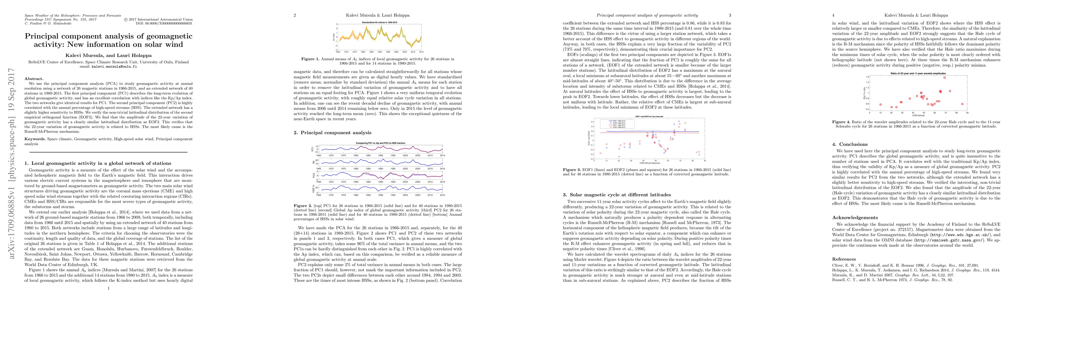 We use the principal component analysis (PCA) to study geomagnetic activity at annual resolution using a network of 26 magnetic stations in 1966-2015, and an extended network of 40 stations in 1980-2015. The first principal component (PC1) describes the long-term evolution of global geomagnetic activity, and has an excellent correlation with indices like the Kp/Ap index. The two networks give identical results for PC1. The second principal component (PC2) is highly correlated with the annual percentage of high-speed streams (HSS). The extended network has a slightly higher sensitivity to HSSs. We verify the non-trivial latitudinal distribution of the second empirical orthogonal function (EOF2). We find that the amplitude of the 22-year variation of geomagnetic activity has a closely similar latitudinal distribution as EOF2. This verifies that the 22-year variation of geomagnetic activity is related to HSSs. The most likely cause is the Russell-McPherron mechanism.