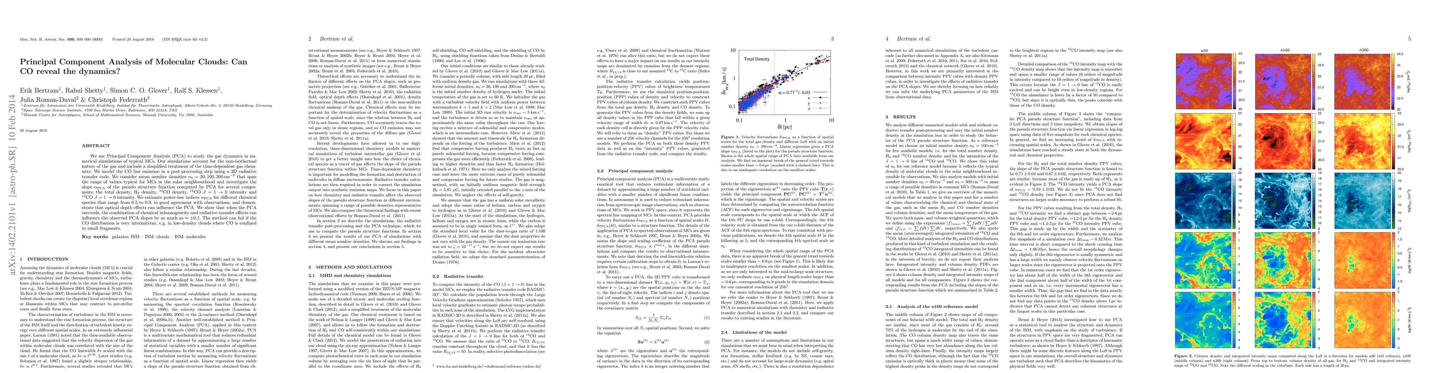We use Principal Component Analysis (PCA) to study the gas dynamics in numerical simulations of typical MCs. Our simulations account for the non-isothermal nature of the gas and include a simplified treatment of the time-dependent gas chemistry. We model the CO line emission in a post-processing step using a 3D radiative transfer code. We consider mean number densities n_0 = 30, 100, 300 cm^{-3} that span the range of values typical for MCs in the solar neighbourhood and investigate the slope \alpha_{PCA} of the pseudo structure function computed by PCA for several components: the total density, H2 density, 12CO density, 12CO J = 1 -> 0 intensity and 13CO J = 1 -> 0 intensity. We estimate power-law indices \alpha_{PCA} for different chemical species that range from 0.5 to 0.9, in good agreement with observations, and demonstrate that optical depth effects can influence the PCA. We show that when the PCA succeeds, the combination of chemical inhomogeneity and radiative transfer effects can influence the observed PCA slopes by as much as ~ +/- 0.1. The method can fail if the CO distribution is very intermittent, e.g. in low-density clouds where CO is confined to small fragments.