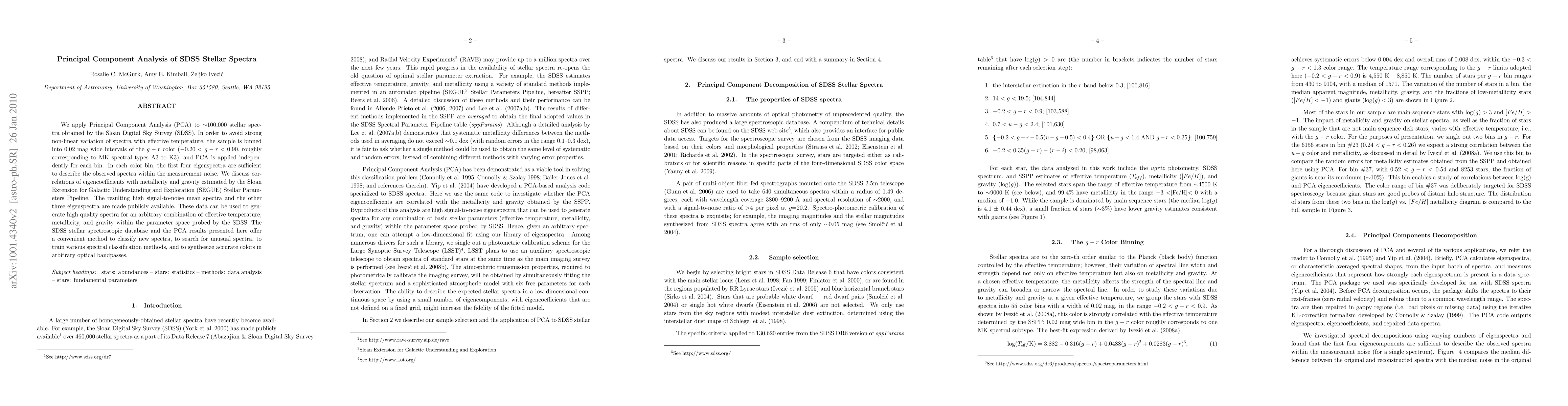 This paper applies PCA to ~100,000 SDSS stellar spectra, binning them by color to mitigate non-linear temperature variations. The first four eigenspectra in each bin capture most spectral variance, allowing for the generation of high-quality spectra based on temperature, metallicity, and gravity.