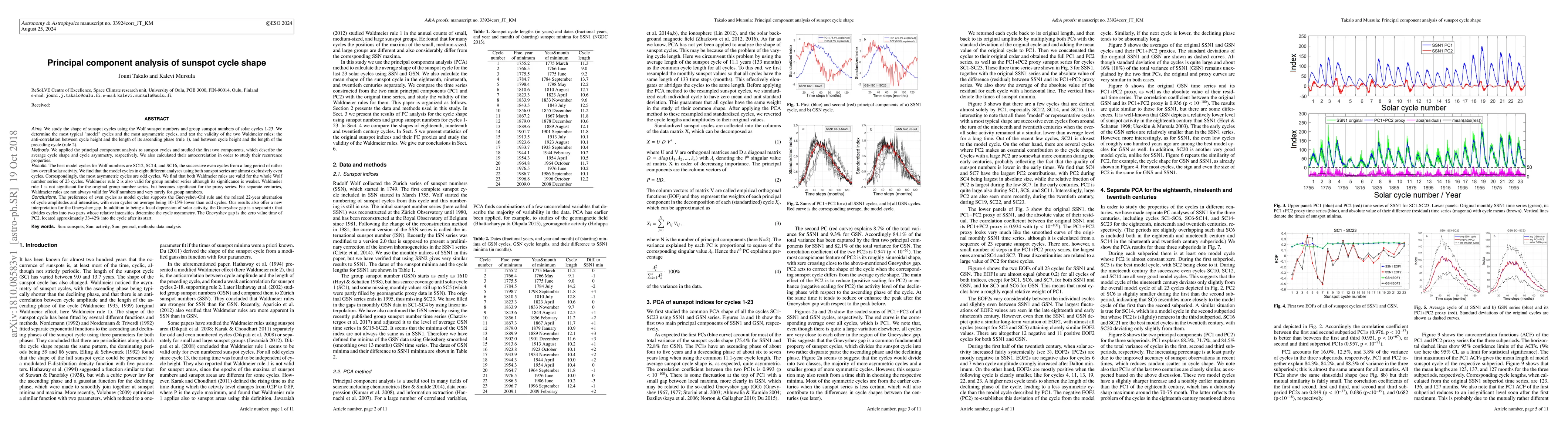 This study uses principal component analysis to analyze sunspot cycle shapes from solar cycles 1-23, identifying typical and asymmetric cycles. It confirms the validity of Waldmeier rules and finds that model cycles are predominantly even, while asymmetric cycles are odd.