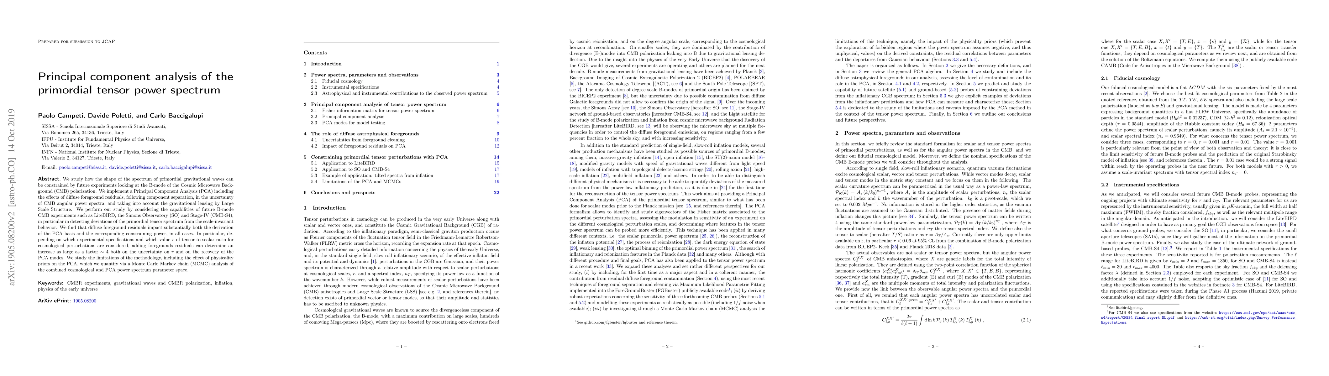 This paper uses Principal Component Analysis (PCA) to study the primordial tensor power spectrum of gravitational waves, focusing on future B-mode CMB experiments. It finds that diffuse foreground residuals significantly impact PCA results and the ability to constrain the tensor-to-scalar ratio, with uncertainties potentially increasing by a factor of four.