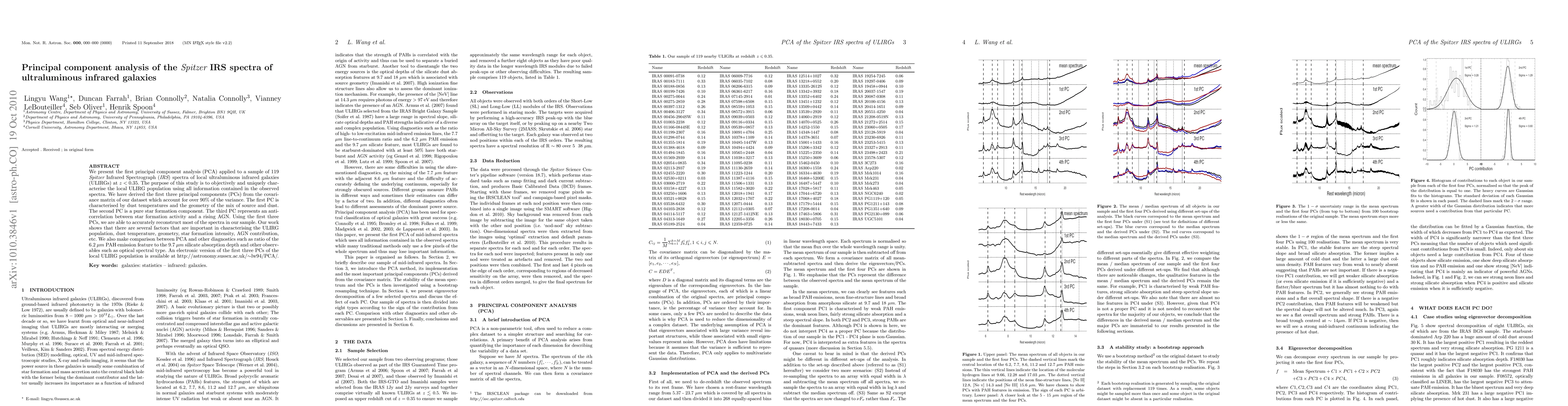 This study conducts a principal component analysis (PCA) on 119 Spitzer IRS spectra of local ultraluminous infrared galaxies (ULIRGs) to characterize their population. The first three principal components reveal significant factors: dust temperature, geometry, star formation, and AGN activity, accounting for over 90% of the variance.