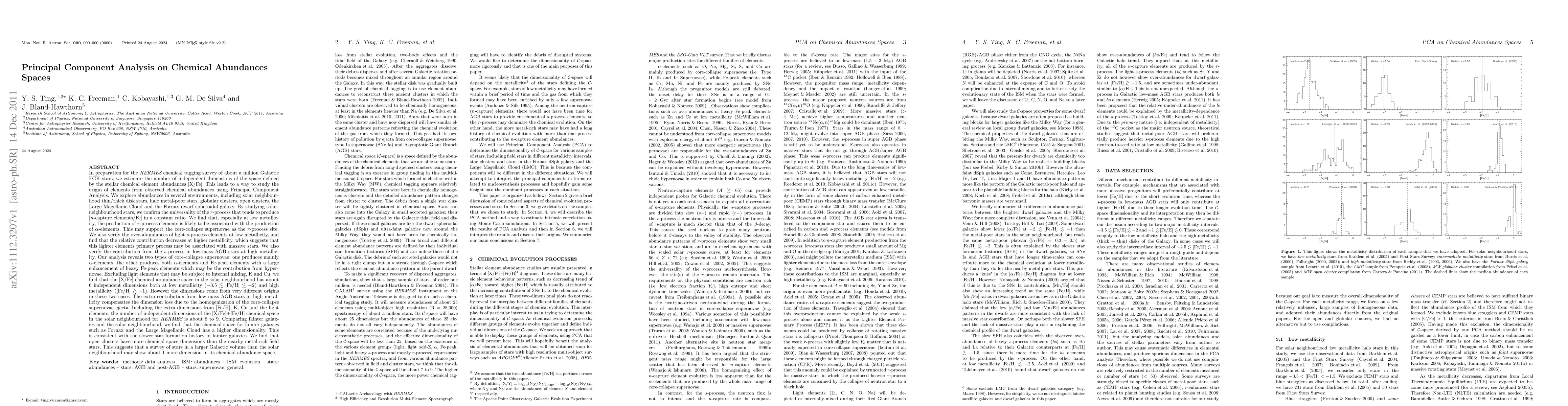 In preparation for the HERMES chemical tagging survey of about a million Galactic FGK stars, we estimate the number of independent dimensions of the space defined by the stellar chemical element abundances [X/Fe]. [...] We explore abundances in several environments, including solar neighbourhood thin/thick disk stars, halo metal-poor stars, globular clusters, open clusters, the Large Magellanic Cloud and the Fornax dwarf spheroidal galaxy. [...] We find that, especially at low metallicity, the production of r-process elements is likely to be associated with the production of alpha-elements. This may support the core-collapse supernovae as the r-process site. We also verify the over-abundances of light s-process elements at low metallicity, and find that the relative contribution decreases at higher metallicity, which suggests that this lighter elements primary process may be associated with massive stars. [...] Our analysis reveals two types of core-collapse supernovae: one produces mainly alpha-elements, the other produces both alpha-elements and Fe-peak elements with a large enhancement of heavy Fe-peak elements which may be the contribution from hypernovae. [...] The extra contribution from low mass AGB stars at high metallicity compensates the dimension loss due to the homogenization of the core-collapse supernovae ejecta. [...] the number of independent dimensions of the [X/Fe]+[Fe/H] chemical space in the solar neighbourhood for HERMES is about 8 to 9. Comparing fainter galaxies and the solar neighbourhood, we find that the chemical space for fainter galaxies such as Fornax and the Large Magellanic Cloud has a higher dimensionality. This is consistent with the slower star formation history of fainter galaxies. [...]