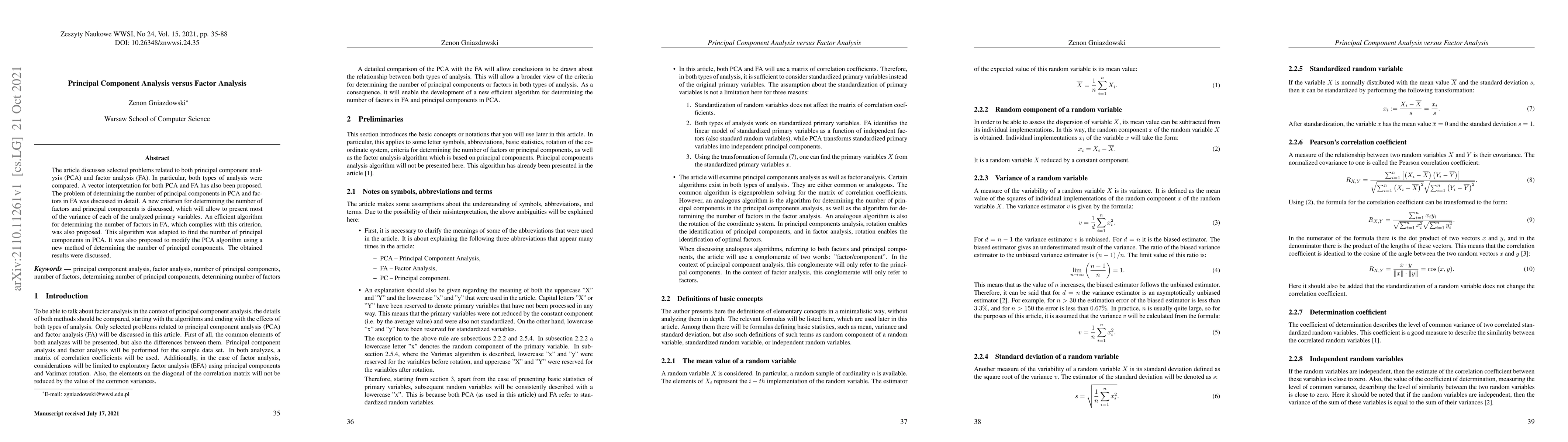 The article discusses selected problems related to both principal component analysis (PCA) and factor analysis (FA). In particular, both types of analysis were compared. A vector interpretation for both PCA and FA has also been proposed. The problem of determining the number of principal components in PCA and factors in FA was discussed in detail. A new criterion for determining the number of factors and principal components is discussed, which will allow to present most of the variance of each of the analyzed primary variables. An efficient algorithm for determining the number of factors in FA, which complies with this criterion, was also proposed. This algorithm was adapted to find the number of principal components in PCA. It was also proposed to modify the PCA algorithm using a new method of determining the number of principal components. The obtained results were discussed.