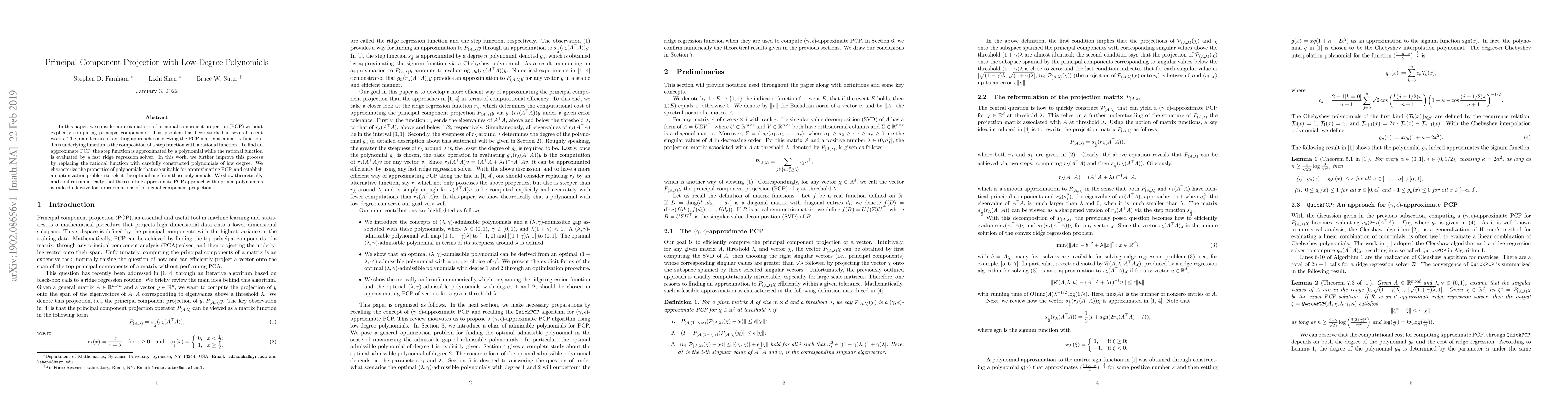 In this paper, we consider approximations of principal component projection (PCP) without explicitly computing principal components. This problem has been studied in several recent works. The main feature of existing approaches is viewing the PCP matrix as a matrix function. This underlying function is the composition of a step function with a rational function. To find an approximate PCP, the step function is approximated by a polynomial while the rational function is evaluated by a fast ridge regression solver. In this work, we further improve this process by replacing the rational function with carefully constructed polynomials of low degree. We characterize the properties of polynomials that are suitable for approximating PCP, and establish an optimization problem to select the optimal one from those polynomials. We show theoretically and confirm numerically that the resulting approximate PCP approach with optimal polynomials is indeed effective for approximations of principal component projection.