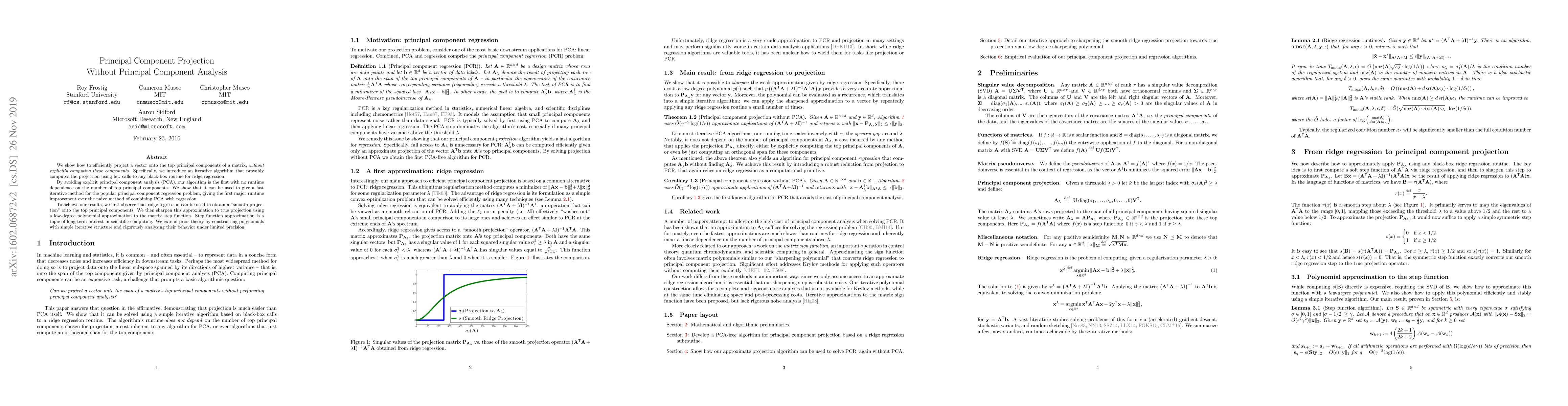 This paper introduces an efficient iterative algorithm to project vectors onto the top principal components of a matrix without performing explicit PCA, using ridge regression and a low-degree polynomial approximation to the matrix step function. This method provides a significant runtime improvement for principal component regression compared to traditional PCA-based methods.