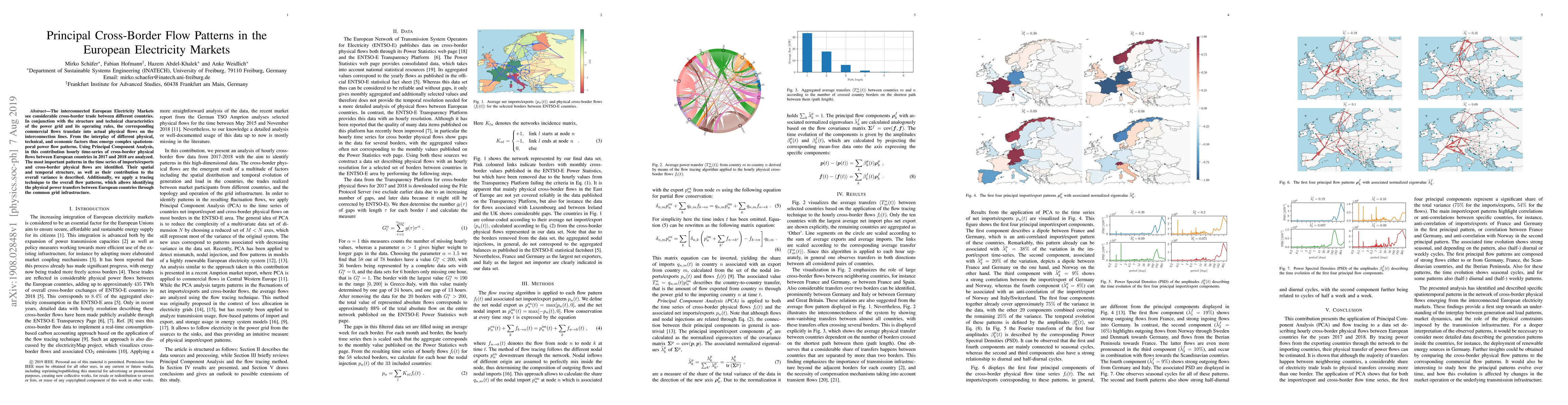 This paper analyzes hourly time-series of cross-border electricity flows in European markets from 2017 and 2018 using Principal Component Analysis to identify key spatial and temporal patterns. The study reveals the most significant cross-border flow patterns and their contribution to overall variance, alongside tracing the physical power transfers through the common grid infrastructure.