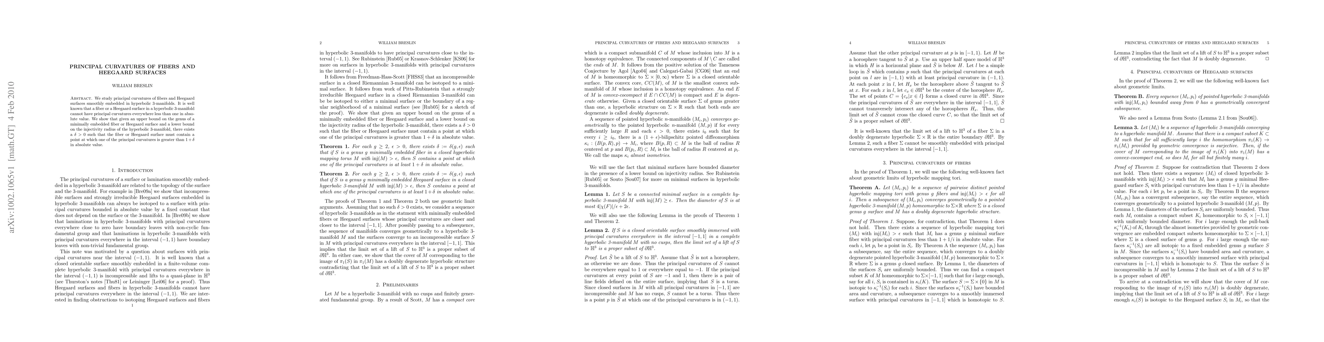 Researchers show that in hyperbolic 3-manifolds, fibers and Heegaard surfaces with certain constraints will inevitably have points where principal curvatures exceed 1 + a small positive value.