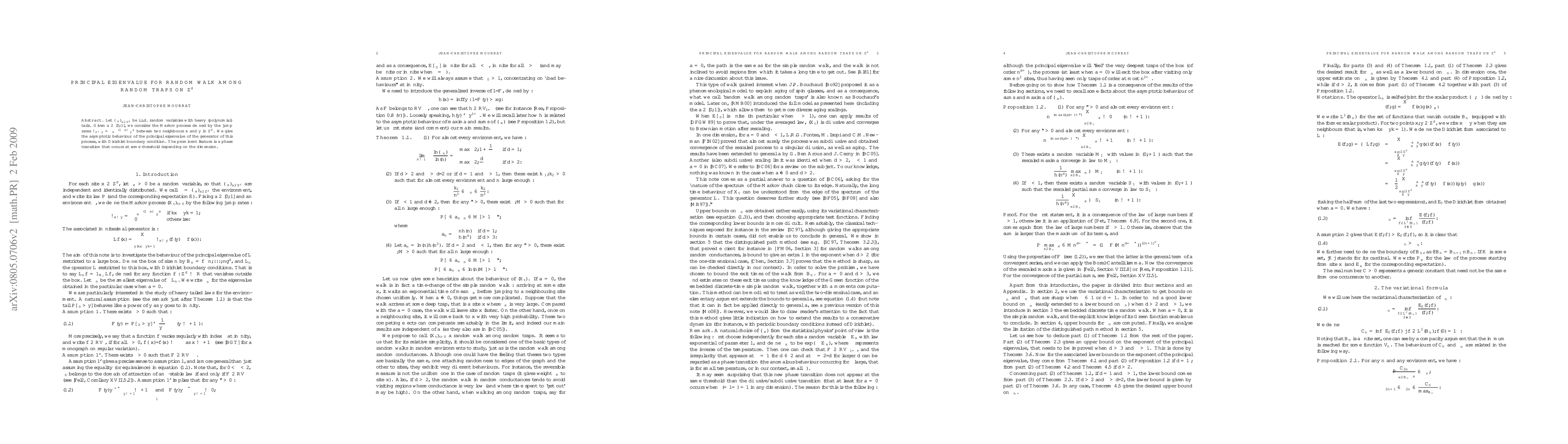 This paper studies a random walk process with random traps on d-dimensional lattices, finding that a phase transition occurs in the principal eigenvalue at some threshold depending on the dimension.