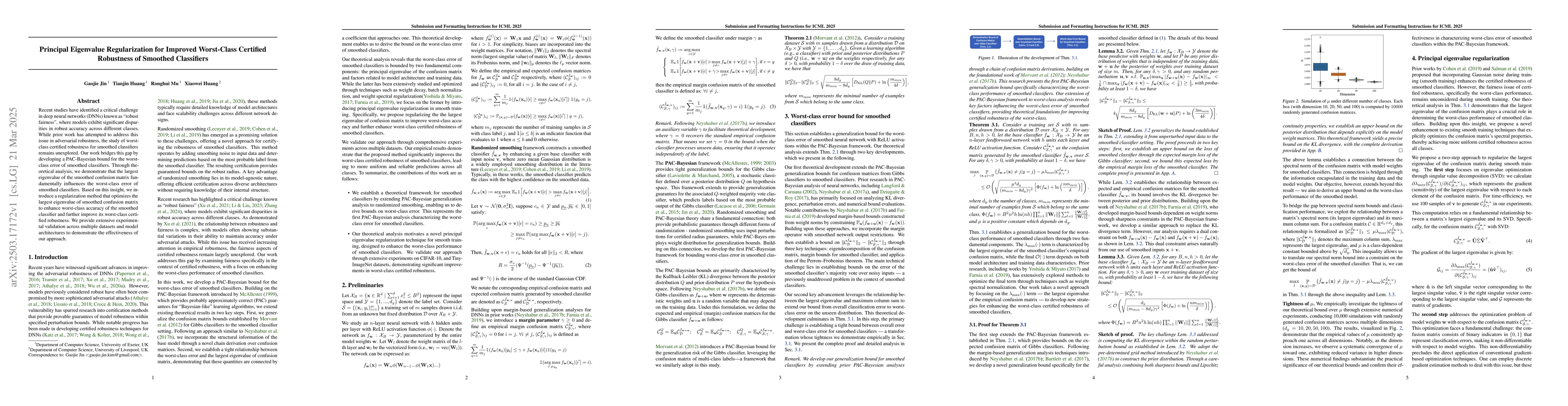 The paper presents a PAC-Bayesian bound for worst-class error and a principal eigenvalue regularization technique for smoothed classifiers, enhancing their worst-class certified robustness.